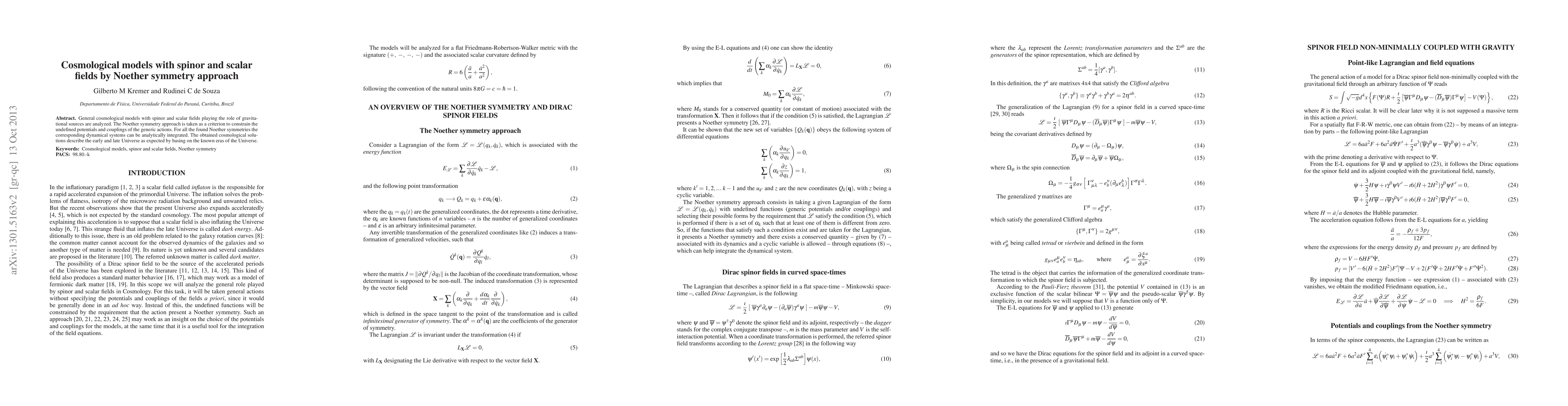 General cosmological models with spinor and scalar fields playing the role of gravitational sources are analyzed. The Noether symmetry approach is taken as a criterion to constrain the undefined potentials and couplings of the generic actions. For all the found Noether symmetries the corresponding dynamical systems can be analytically integrated. The obtained cosmological solutions describe the early and late Universe as expected by basing on the known eras of the Universe.