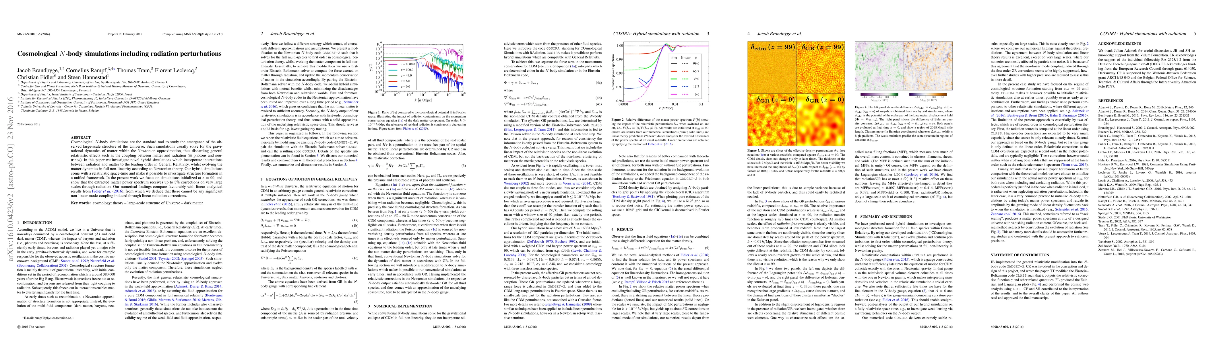 This paper presents novel hybrid cosmological simulations that incorporate relativistic effects between radiation and matter, showing up to 3% corrections in the matter power spectrum on large scales. The simulations, initialized at high redshift, reveal no significant non-linear mode-coupling effects from linear radiation corrections.