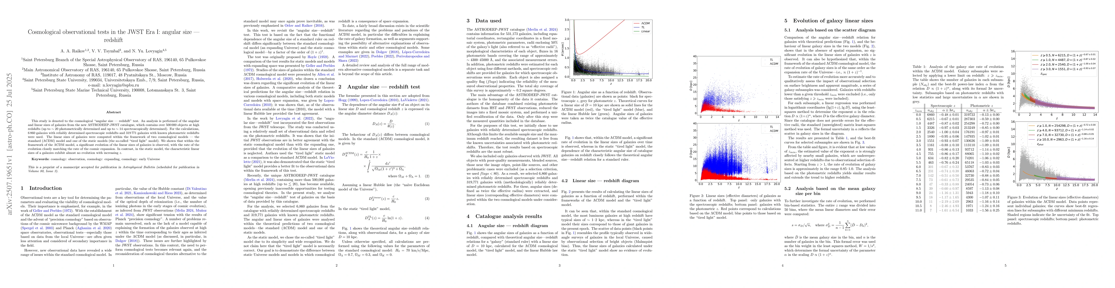 This study is denoted to the cosmological "angular size - redshift" test. An analysis is performed of the angular and linear sizes of galaxies from the new ASTRODEEP-JWST catalogue, which contains over 500,000 objects at high redshifts (up to ~20 photometrically determined and up to ~14 spectroscopically determined). For the calculations, 6 860 galaxies with reliably determined spectroscopic redshifts and 319,771 galaxies with known photometric redshifts were used. The linear sizes of galaxies were computed within the framework of two cosmological models - the standard ({\Lambda}CDM) model and one of the static models (the so-called "tired light" model). We shown that within the framework of the {\Lambda}CDM model, a significant evolution of the linear sizes of galaxies is observed, with the rate of the evolution closely matching the rate of the cosmic expansion. In contrast, in the static model, the characteristic linear sizes of a galaxies exhibit almost no evolution with increasing z.