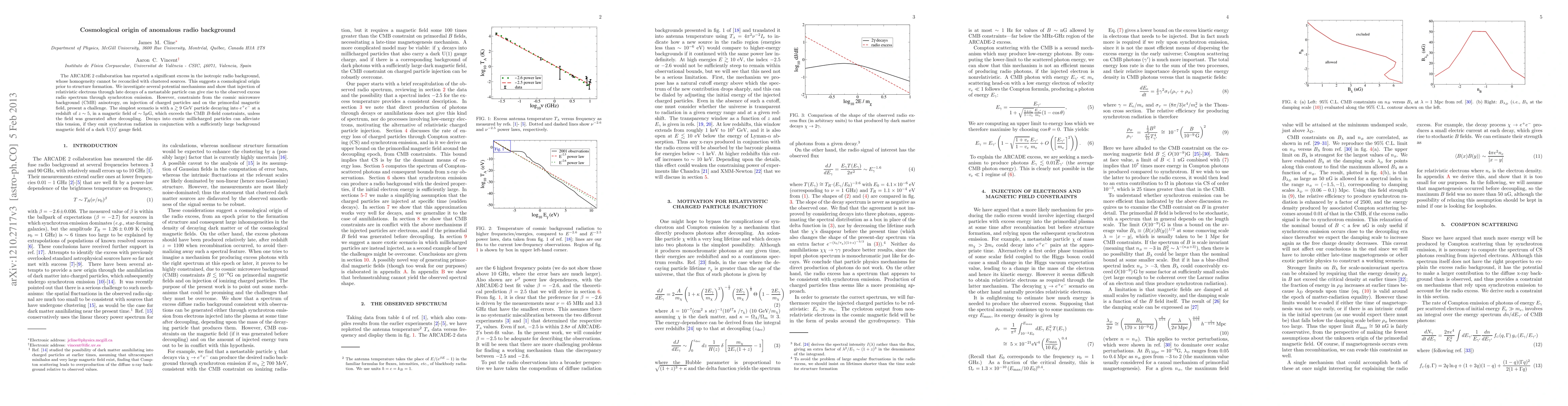 The ARCADE 2 collaboration has reported a significant excess in the isotropic radio background, whose homogeneity cannot be reconciled with clustered sources. This suggests a cosmological origin prior to structure formation. We investigate several potential mechanisms and show that injection of relativistic electrons through late decays of a metastable particle can give rise to the observed excess radio spectrum through synchrotron emission. However, constraints from the cosmic microwave background (CMB) anisotropy, on injection of charged particles and on the primordial magnetic field, present a challenge. The simplest scenario is with a >~ 9 GeV particle decaying into e+e- at a redshift of z ~ 5, in a magnetic field of ~ 5 microgauss, which exceeds the CMB B-field constraints, unless the field was generated after decoupling. Decays into exotic millicharged particles can alleviate this tension, if they emit synchroton radiation in conjunction with a sufficiently large background magnetic field of a dark U(1)' gauge field.