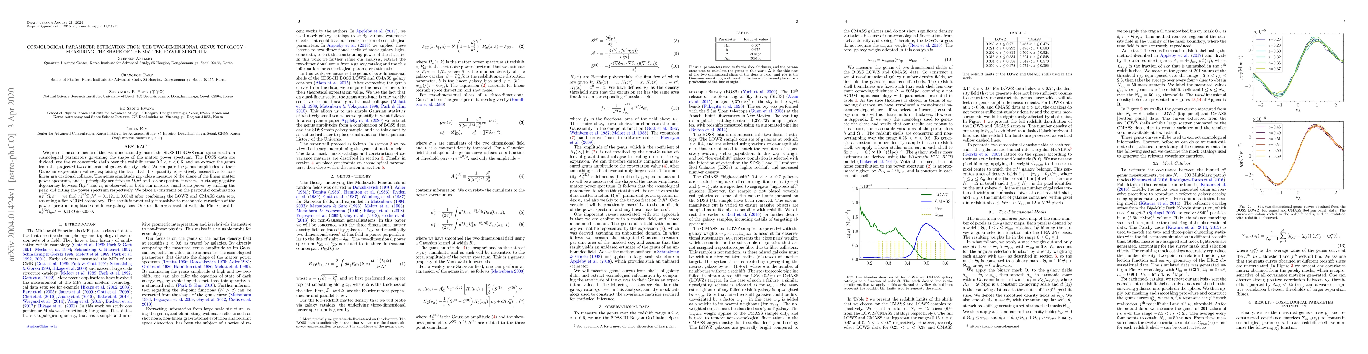We present measurements of the two-dimensional genus of the SDSS-III BOSS catalogs to constrain cosmological parameters governing the shape of the matter power spectrum. The BOSS data are divided into twelve concentric shells over the redshift range $0.2 < z < 0.6$, and we extract the genus from the projected two-dimensional galaxy density fields. We compare the genus amplitudes to their Gaussian expectation values, exploiting the fact that this quantity is relatively insensitive to non-linear gravitational collapse. The genus amplitude provides a measure of the shape of the linear matter power spectrum, and is principally sensitive to $\Omega_{\rm c}h^{2}$ and scalar spectral index $n_{\rm s}$. A strong negative degeneracy between $\Omega_{\rm c}h^{2}$ and $n_{\rm s}$ is observed, as both can increase small scale power by shifting the peak and tilting the power spectrum respectively. We place a constraint on the particular combination $n_{\rm s}^{3/2} \Omega_{\rm c}h^{2}$ -- we find $n_{\rm s}^{3/2} \Omega_{\rm c}h^{2} = 0.1121 \pm 0.0043$ after combining the LOWZ and CMASS data sets, assuming a flat $\Lambda$CDM cosmology. This result is practically insensitive to reasonable variations of the power spectrum amplitude and linear galaxy bias. Our results are consistent with the Planck best fit $n_{\rm s}^{3/2}\Omega_{\rm c}h^{2} = 0.1139 \pm 0.0009$.