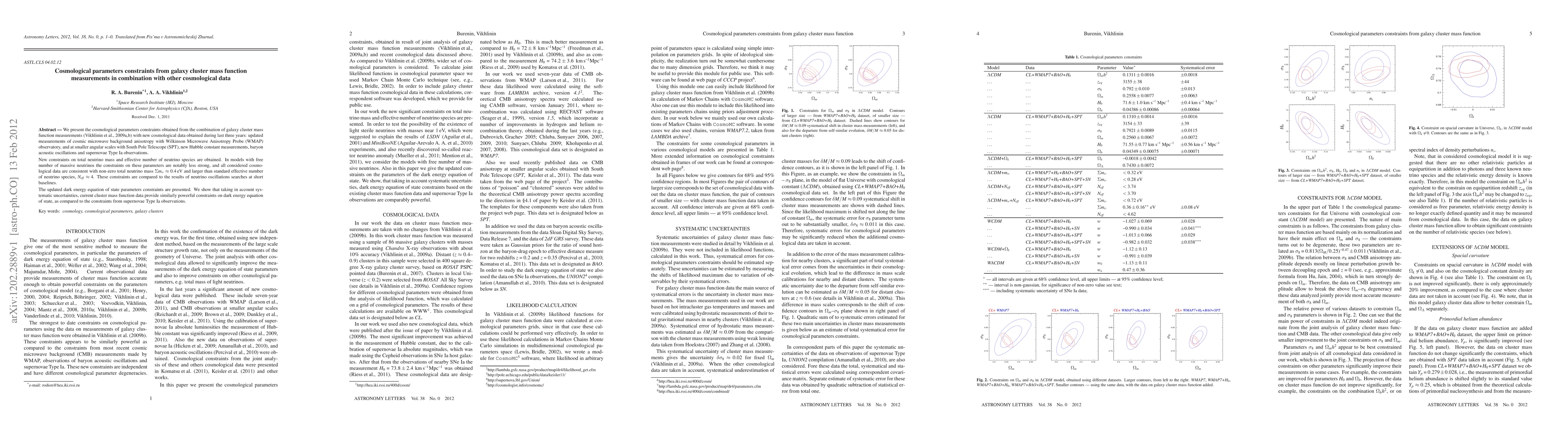 We present the cosmological parameters constraints obtained from the combination of galaxy cluster mass function measurements (Vikhlinin et al., 2009a,b) with new cosmological data obtained during last three years: updated measurements of cosmic microwave background anisotropy with Wilkinson Microwave Anisotropy Probe (WMAP) observatory, and at smaller angular scales with South Pole Telescope (SPT), new Hubble constant measurements, baryon acoustic oscillations and supernovae Type Ia observations. New constraints on total neutrino mass and effective number of neutrino species are obtained. In models with free number of massive neutrinos the constraints on these parameters are notably less strong, and all considered cosmological data are consistent with non-zero total neutrino mass \Sigma m_\nu \approx 0.4 eV and larger than standard effective number of neutrino species, N_eff \approx 4. These constraints are compared to the results of neutrino oscillations searches at short baselines. The updated dark energy equation of state parameters constraints are presented. We show that taking in account systematic uncertainties, current cluster mass function data provide similarly powerful constraints on dark energy equation of state, as compared to the constraints from supernovae Type Ia observations.