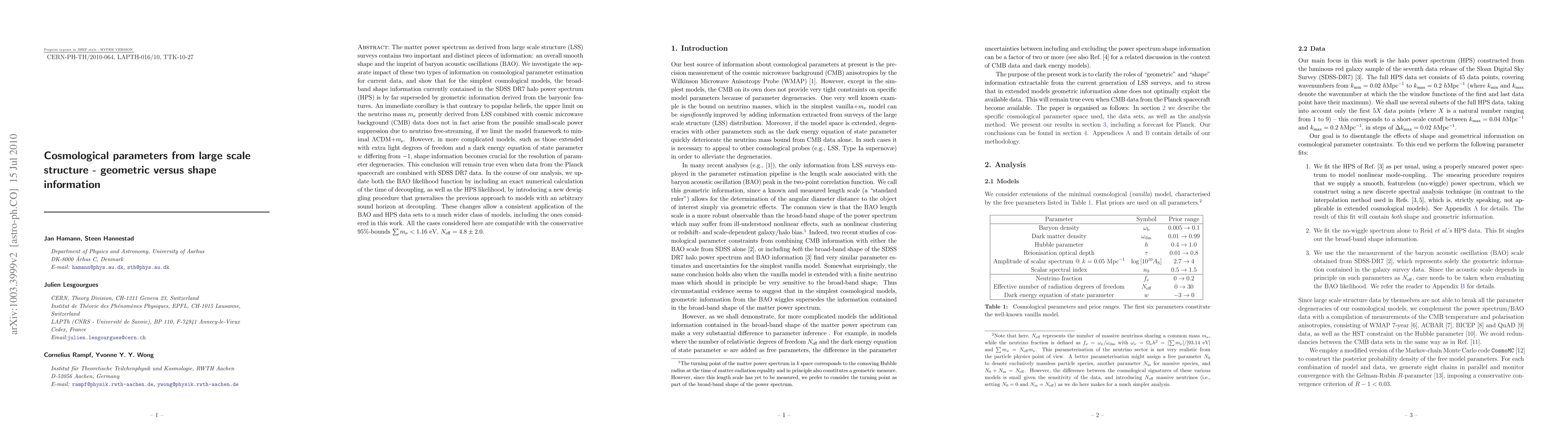 The matter power spectrum as derived from large scale structure (LSS) surveys contains two important and distinct pieces of information: an overall smooth shape and the imprint of baryon acoustic oscillations (BAO). We investigate the separate impact of these two types of information on cosmological parameter estimation, and show that for the simplest cosmological models, the broad-band shape information currently contained in the SDSS DR7 halo power spectrum (HPS) is by far superseded by geometric information derived from the baryonic features. An immediate corollary is that contrary to popular beliefs, the upper limit on the neutrino mass m_\nu presently derived from LSS combined with cosmic microwave background (CMB) data does not in fact arise from the possible small-scale power suppression due to neutrino free-streaming, if we limit the model framework to minimal LambdaCDM+m_\nu. However, in more complicated models, such as those extended with extra light degrees of freedom and a dark energy equation of state parameter w differing from -1, shape information becomes crucial for the resolution of parameter degeneracies. This conclusion will remain true even when data from the Planck surveyor become available. In the course of our analysis, we introduce a new dewiggling procedure that allows us to extend consistently the use of the SDSS HPS to models with an arbitrary sound horizon at decoupling. All the cases considered here are compatible with the conservative 95%-bounds \sum m_\nu < 1.16 eV, N_eff = 4.8 \pm 2.0.