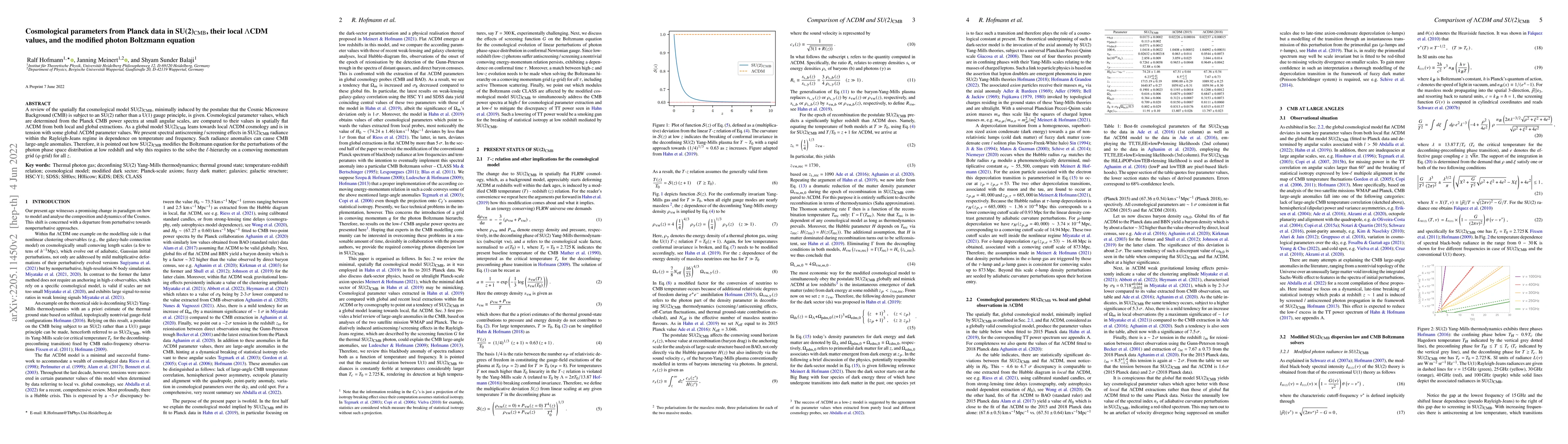 A review of the spatially flat cosmological model SU(2)$_{\rm CMB}$, minimally induced by the postulate that the Cosmic Microwave Background (CMB) is subject to an SU(2) rather than a U(1) gauge principle, is given. Cosmological parameter values, which are determined from the Planck CMB power spectra at small angular scales, are compared to their values in spatially flat $\Lambda$CDM from both local and global extractions. As a global model SU(2)$_{\rm CMB}$ leans towards local $\Lambda$CDM cosmology and is in tension with some global $\Lambda$CDM parameter values. We present spectral antiscreening / screening effects in SU(2)$_{\rm CMB}$ radiance within the Rayleigh-Jeans regime in dependence on temperature and frequency. Such radiance anomalies can cause CMB large-angle anomalies. Therefore, it is pointed out how SU(2)$_{\rm CMB}$ modifies the Boltzmann equation for the perturbations of the photon phase space distribution at low redshift and why this requires to the solve the $\ell$-hierarchy on a comoving momentum grid ($q$-grid) for all $z$.