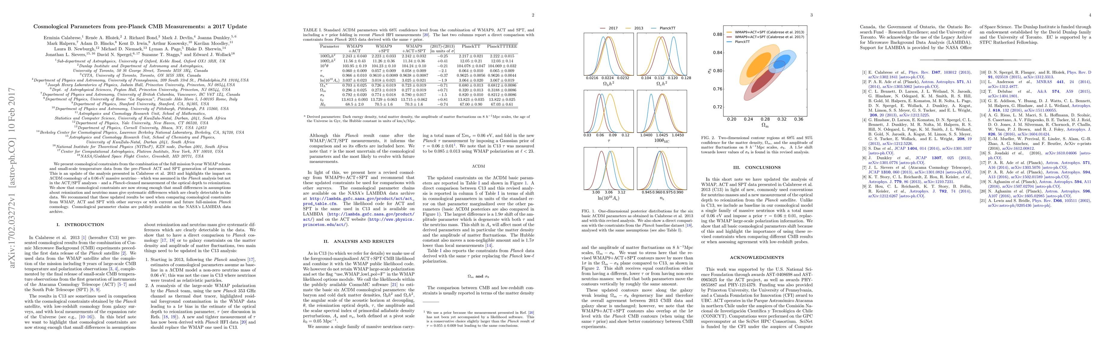 We present cosmological constraints from the combination of the full mission 9-year WMAP release and small-scale temperature data from the pre-Planck ACT and SPT generation of instruments. This is an update of the analysis presented in Calabrese et al. 2013 and highlights the impact on $\Lambda$CDM cosmology of a 0.06 eV massive neutrino - which was assumed in the Planck analysis but not in the ACT/SPT analyses - and a Planck-cleaned measurement of the optical depth to reionization. We show that cosmological constraints are now strong enough that small differences in assumptions about reionization and neutrino mass give systematic differences which are clearly detectable in the data. We recommend that these updated results be used when comparing cosmological constraints from WMAP, ACT and SPT with other surveys or with current and future full-mission Planck cosmology. Cosmological parameter chains are publicly available on the NASA's LAMBDA data archive.