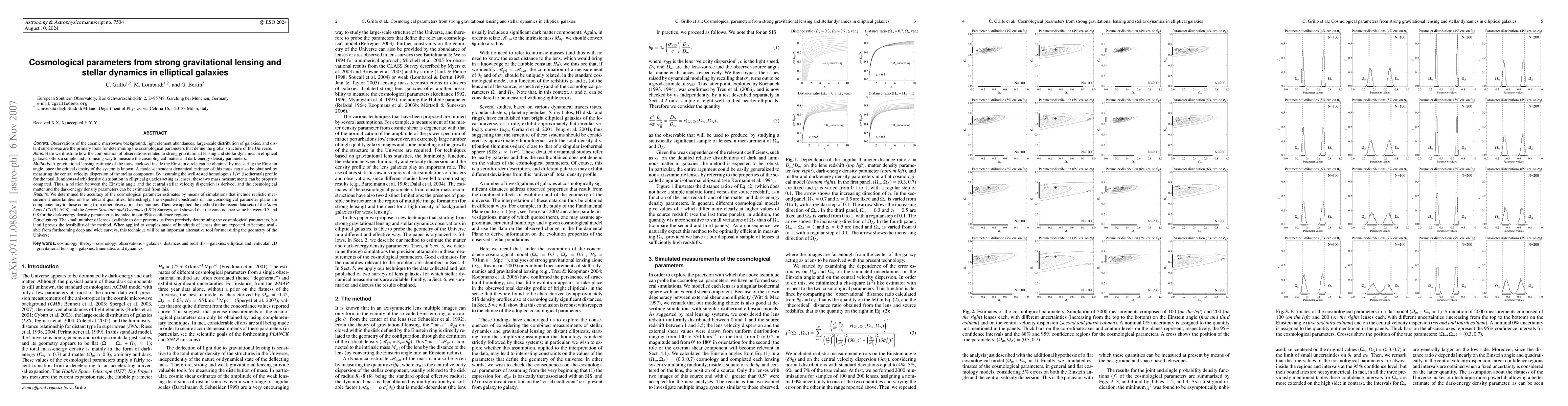 This paper proposes a novel method combining strong gravitational lensing and stellar dynamics in elliptical galaxies to measure cosmological matter and dark-energy density parameters. By comparing lensing and dynamical mass estimates, the authors derive a relation between the Einstein angle and stellar velocity dispersion, demonstrating the feasibility of this approach with current data and highlighting its potential for future surveys.
