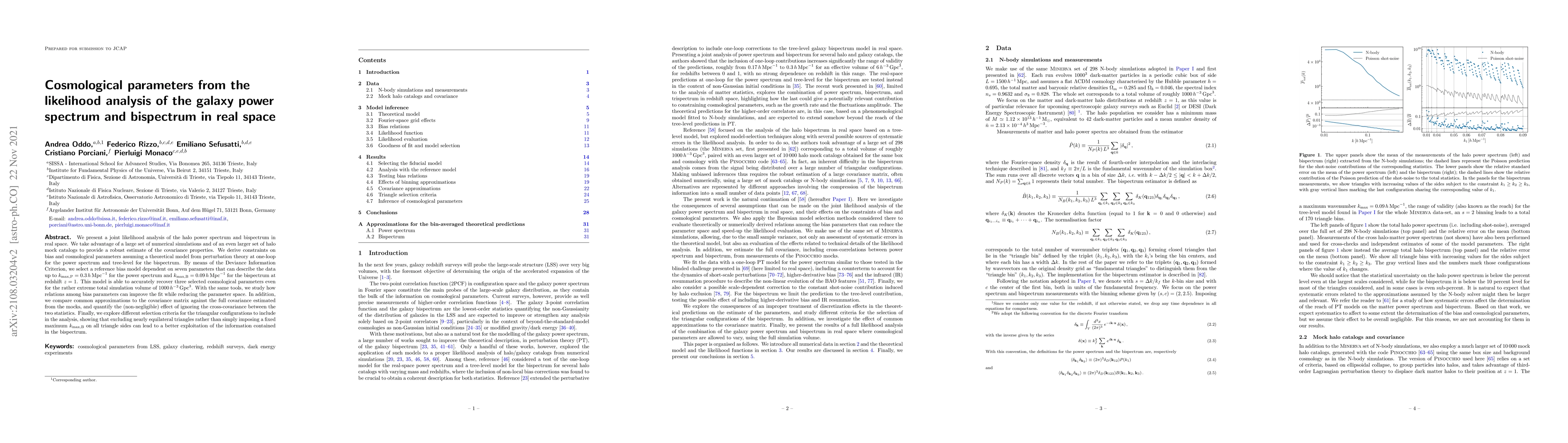 We present a joint likelihood analysis of the halo power spectrum and bispectrum in real space. We take advantage of a large set of numerical simulations and of an even larger set of halo mock catalogs to provide a robust estimate of the covariance properties. We derive constraints on bias and cosmological parameters assuming a theoretical model from perturbation theory at one-loop for the power spectrum and tree-level for the bispectrum. By means of the Deviance Information Criterion, we select a reference bias model dependent on seven parameters that can describe the data up to $k_{\rm max,P}=0.3\, h \, {\rm Mpc}^{-1}$ for the power spectrum and $k_{\rm max,B}=0.09\, h \, {\rm Mpc}^{-1}$ for the bispectrum at redshift $z=1$. This model is able to accurately recover three selected cosmological parameters even for the rather extreme total simulation volume of $1000\, h^{-3} \, {\rm Gpc}^3$. With the same tools, we study how relations among bias parameters can improve the fit while reducing the parameter space. In addition, we compare common approximations to the covariance matrix against the full covariance estimated from the mocks, and quantify the (non-negligible) effect of ignoring the cross-covariance between the two statistics. Finally, we explore different selection criteria for the triangular configurations to include in the analysis, showing that excluding nearly equilateral triangles rather than simply imposing a fixed maximum $k_{\rm max,B}$ on all triangle sides can lead to a better exploitation of the information contained in the bispectrum.