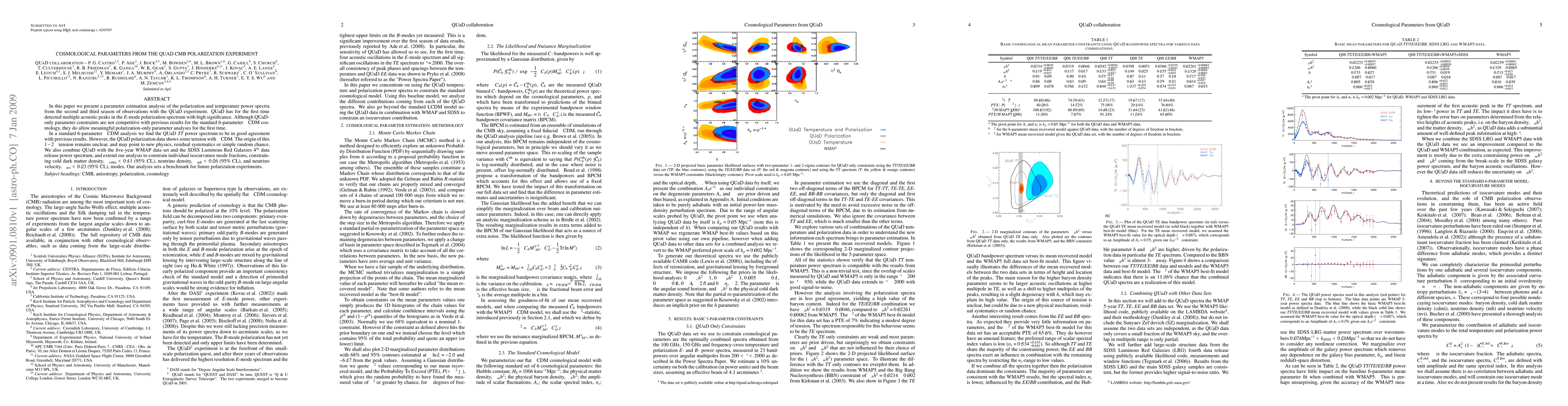 The QUaD experiment detected multiple acoustic peaks in the E-mode polarization spectrum, providing meaningful polarization-only parameter analyses. Combined with WMAP and SDSS data, it constrains cosmological parameters, though some tension with the LCDM model remains unexplained.