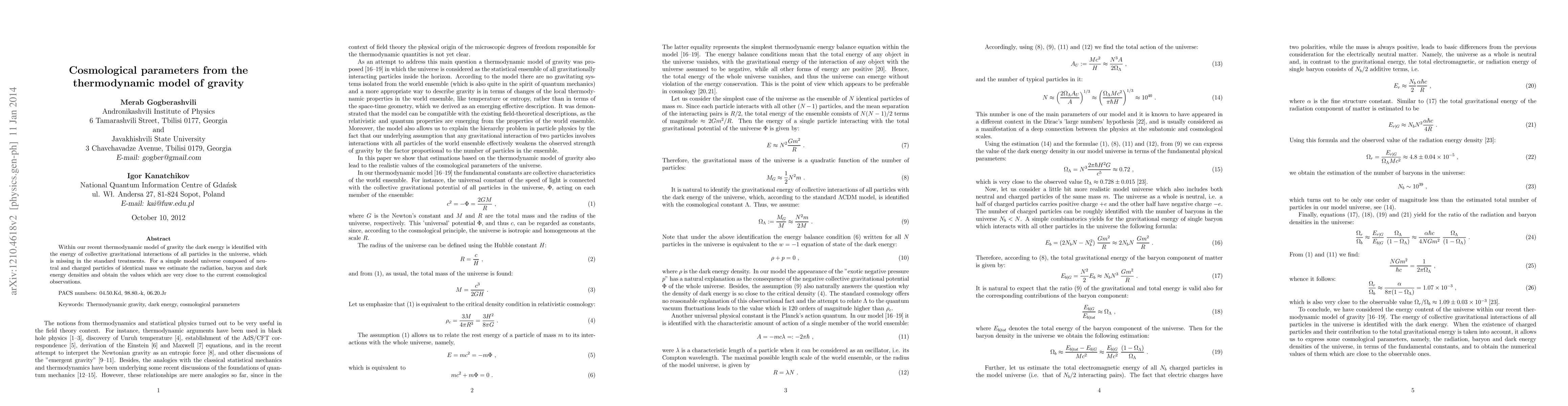 Within our recent thermodynamic model of gravity the dark energy is identified with the energy of collective gravitational interactions of all particles in the universe, which is missing in the standard treatments. For a simple model universe composed of neutral and charged particles of identical mass we estimate the radiation, baryon and dark energy densities and obtain the values which are very close to the current cosmological observations.
