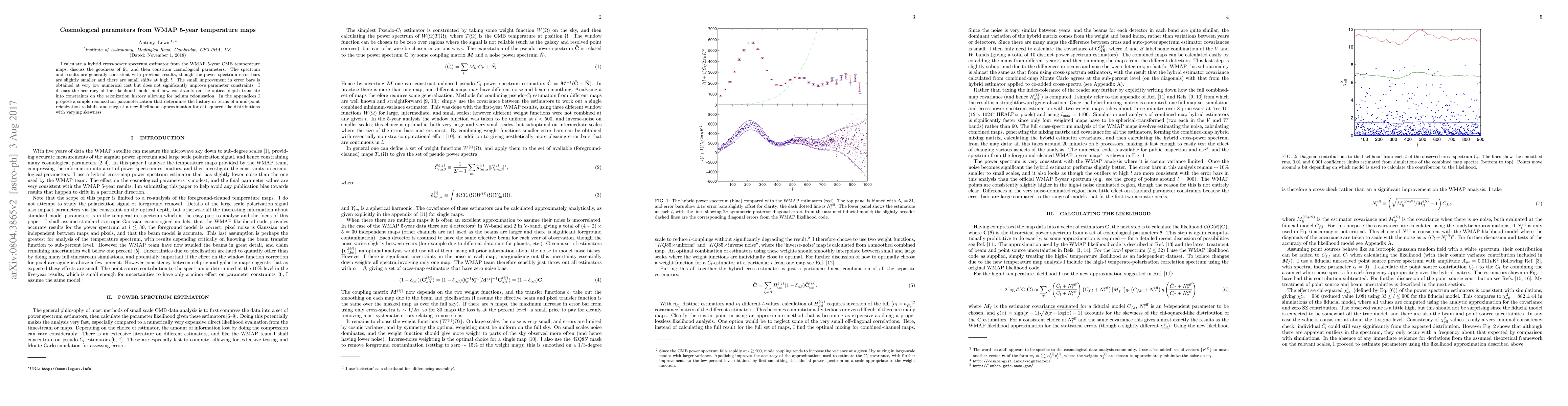 I calculate a hybrid cross-power spectrum estimator from the WMAP 5-year CMB temperature maps, discuss the goodness of fit, and then constrain cosmological parameters. The spectrum and results are generally consistent with previous results, though the power spectrum error bars are slightly smaller and there are small shifts at high ell. The small improvement in error bars is obtained at very low numerical cost but does not significantly improve parameter constraints. I discuss the accuracy of the likelihood model and how constraints on the optical depth translate into constraints on the reionization history allowing for helium reionization. In the appendices I propose a simple reionization parameterization that determines the history in terms of a mid-point reionization redshift, and suggest a new likelihood approximation for chi-squared-like distributions with varying skewness.