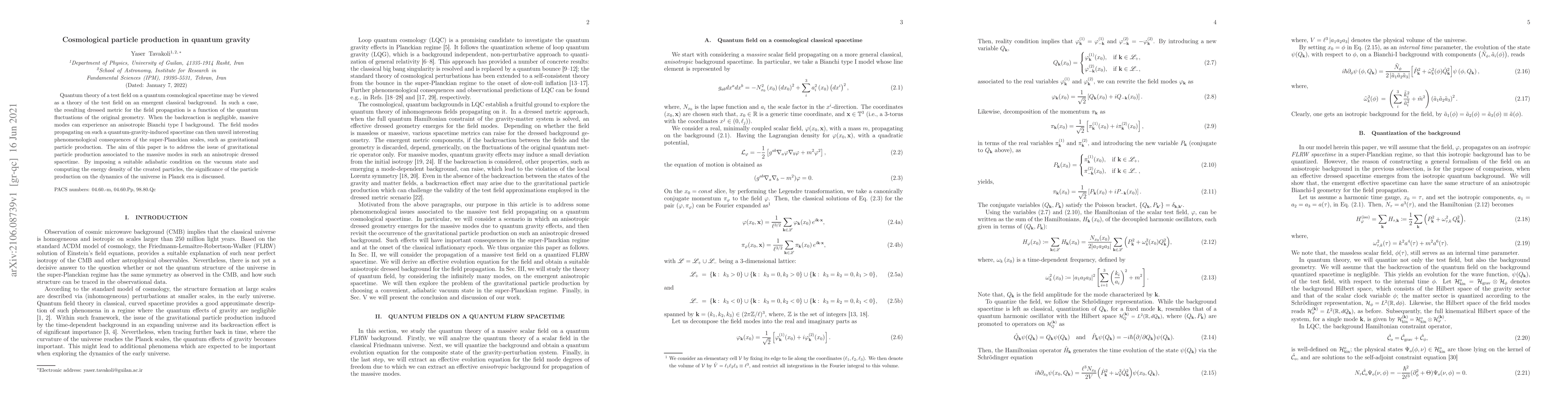 Quantum theory of a test field on a quantum cosmological spacetime may be viewed as a theory of the test field on an emergent classical background. In such a case, the resulting dressed metric for the field propagation is a function of the quantum fluctuations of the original geometry. When the backreaction is negligible, massive modes can experience an anisotropic Bianchi type I background. The field modes propagating on such a quantum-gravity-induced spacetime can then unveil interesting phenomenological consequences of the super-Planckian scales, such as gravitational particle production. The aim of this paper is to address the issue of gravitational particle production associated to the massive modes in such an anisotropic dressed spacetime. By imposing a suitable adiabatic condition on the vacuum state and computing the energy density of the created particles, the significance of the particle production on the dynamics of the universe in Planck era is discussed.