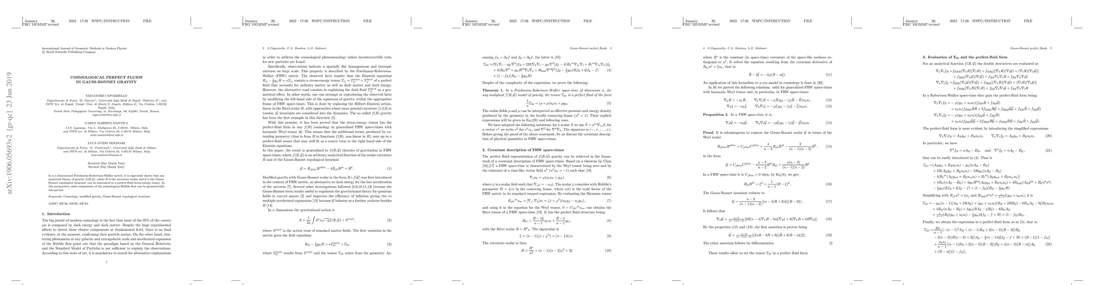 In an $n$-dimensional Friedmann-Robertson-Walker metric, it is rigorously shown that any analytical theory of gravity $f(R,{\cal G})$, where $R$ is the curvature scalar and $\cal G$ is the Gauss-Bonnet topological invariant, can be associated to a perfect-fluid stress-energy tensor. In this perspective, dark components of the cosmological Hubble flow can be geometrically interpreted.