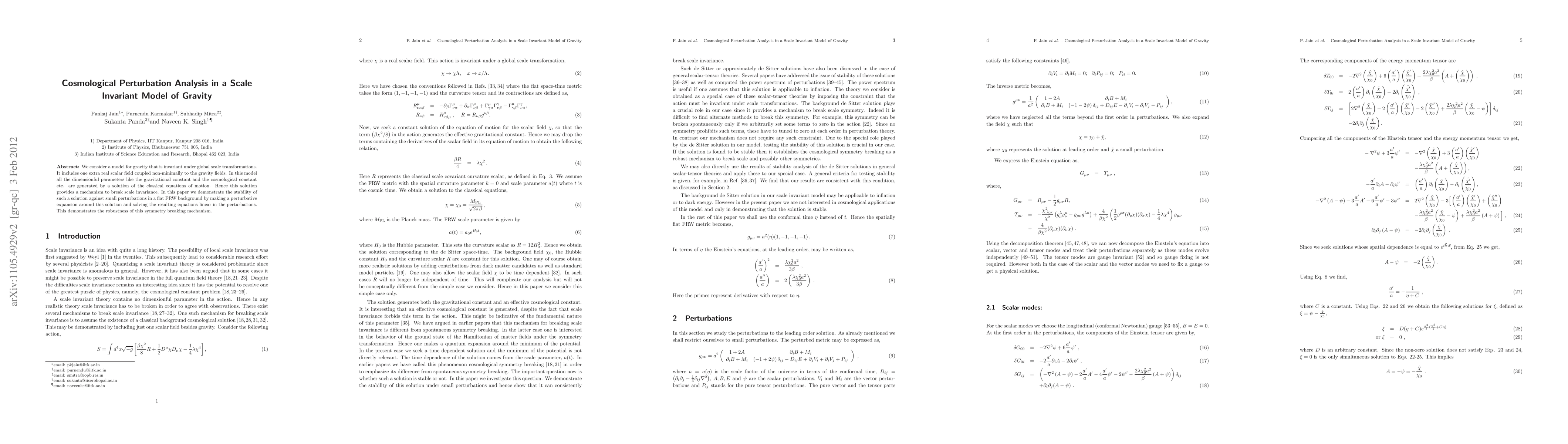 This paper explores a scale invariant model of gravity with an extra scalar field, demonstrating how the model's stability is maintained against small perturbations in a flat Friedmann-Robertson-Walker (FRW) background through a perturbative analysis. The study shows that dimensionful parameters emerge naturally from the model's solution, which breaks scale invariance.
