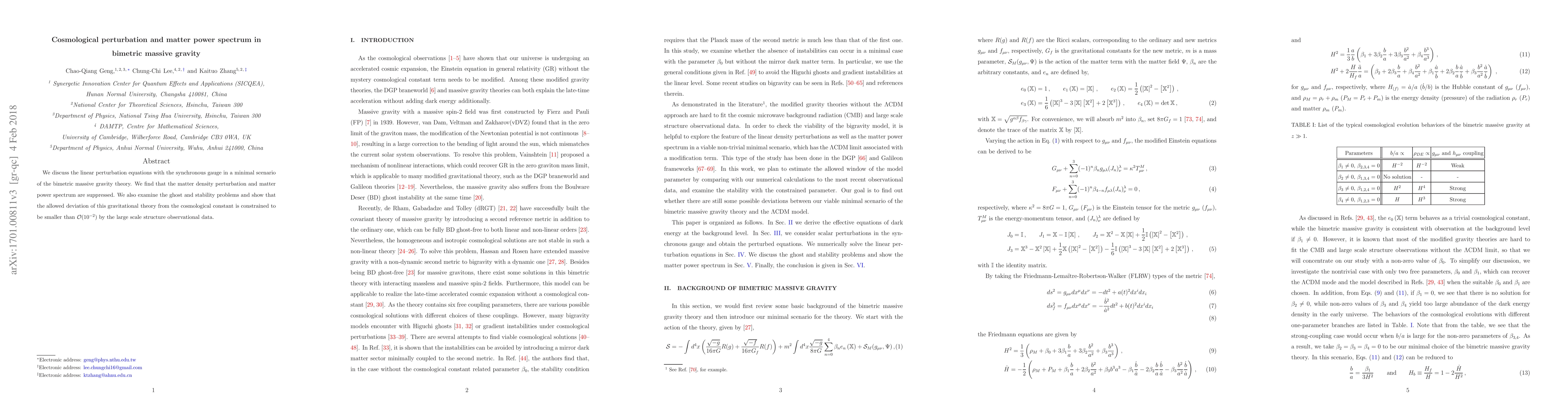 We discuss the linear perturbation equations with the synchronous gauge in a minimal scenario of the bimetric massive gravity theory. We find that the matter density perturbation and matter power spectrum are suppressed. We also examine the ghost and stability problems and show that the allowed deviation of this gravitational theory from the cosmological constant is constrained to be smaller than $\mathcal{O}(10^{-2})$ by the large scale structure observational data.