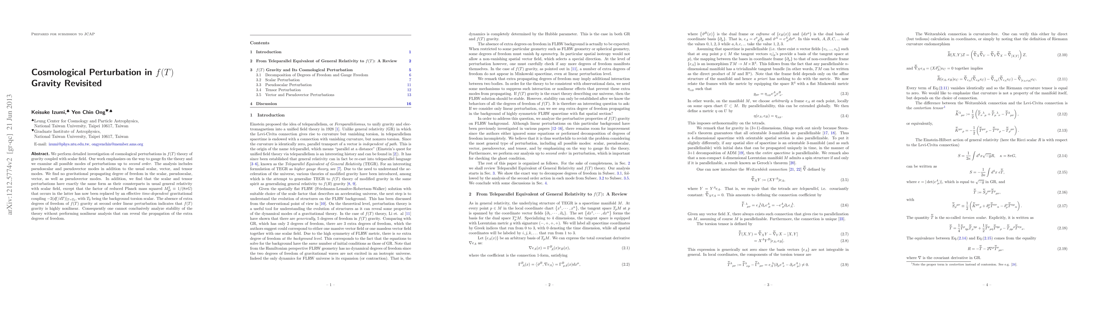 We perform detailed investigation of cosmological perturbations in f(T) theory of gravity coupled with scalar field. Our work emphasizes on the way to gauge fix the theory and we examine all possible modes of perturbations up to second order. The analysis includes pseudoscalar and pseudovector modes in addition to the usual scalar, vector, and tensor modes. We find no gravitational propagating degree of freedom in the scalar, pseudoscalar, vector, as well as pseudovector modes. In addition, we find that the scalar and tensor perturbations have exactly the same form as their counterparts in usual general relativity with scalar field, except that the factor of reduced Planck mass squared $M_{\text{pl}}^2 \equiv 1/(8\pi G)$ that occurs in the latter has now been replaced by an effective time-dependentgravitational coupling $-2 (df/dT)|_{T=T_0}$, with $T_0$ being the background torsion scalar. The absence of extra degrees of freedom of f(T) gravity at second order linear perturbation indicates that f(T) gravity is highly nonlinear. Consequently one cannot conclusively analyze stability of the theory without performing nonlinear analysis that can reveal the propagation of the extra degrees of freedom.
