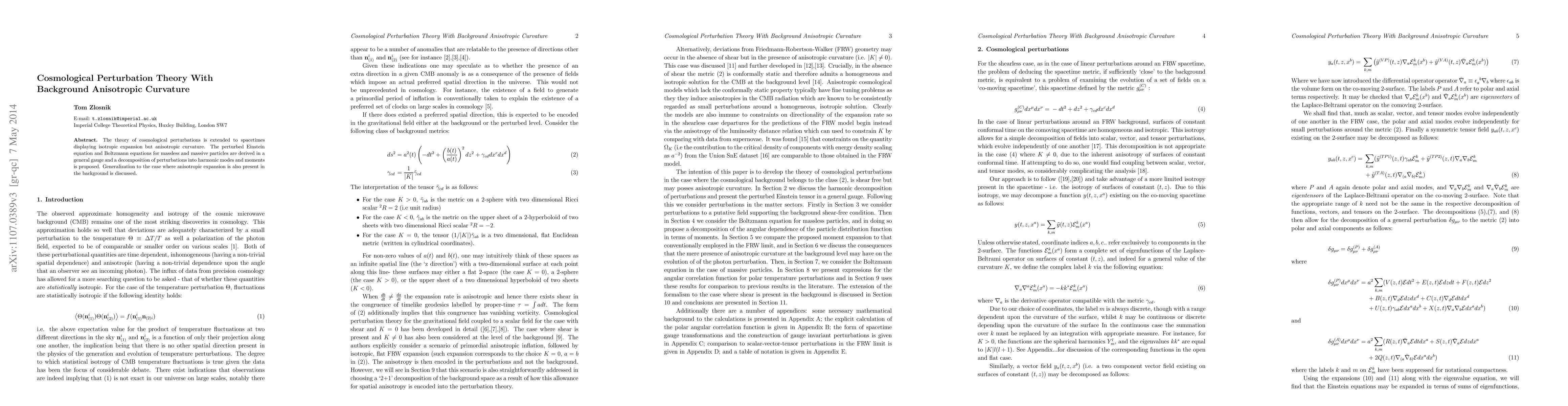 This paper extends cosmological perturbation theory to spacetimes with isotropic expansion but anisotropic curvature, deriving perturbed Einstein and Boltzmann equations, and proposing a decomposition of perturbations into harmonic modes and moments. It also discusses generalizations for backgrounds with anisotropic expansion.