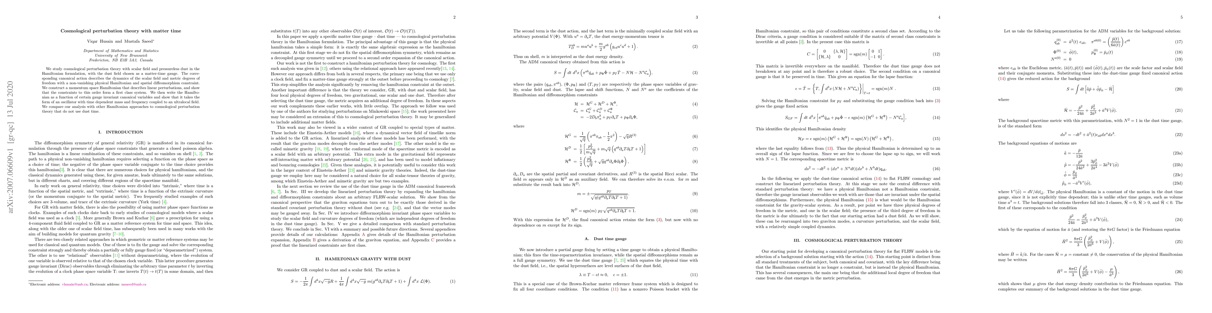 This paper explores cosmological perturbation theory using scalar fields and pressureless dust in a Hamiltonian framework, employing matter time as a gauge. It constructs a momentum space Hamiltonian for linear perturbations, demonstrating that the constraints form a first-class system and showing the Hamiltonian's oscillator-like form with time-dependent parameters, contrasting with non-dust time gauge approaches.