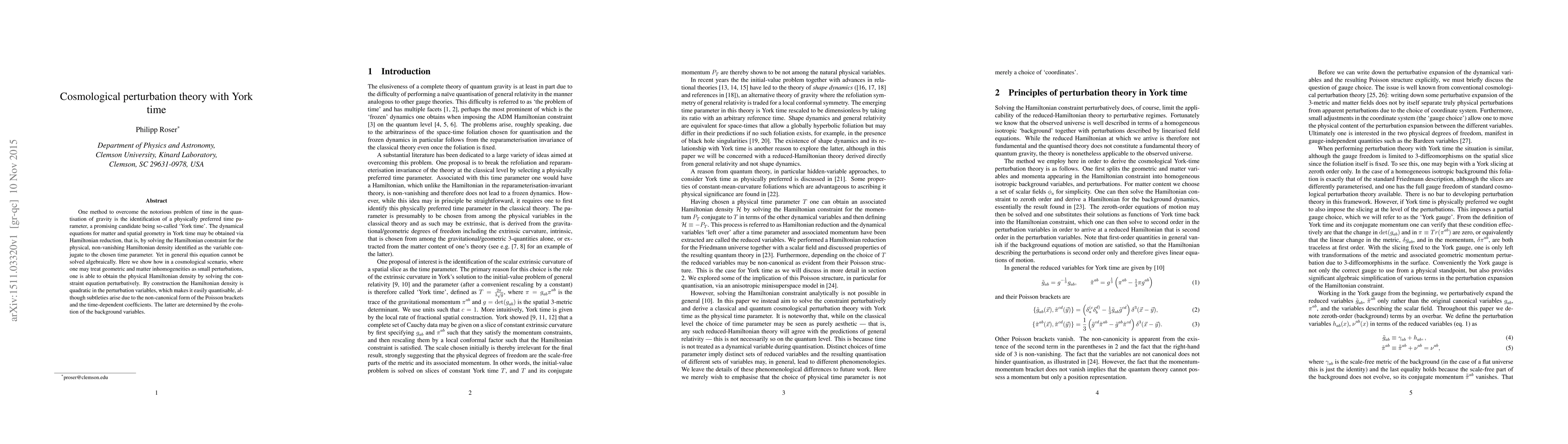 This paper develops a cosmological perturbation theory using York time to address the challenge of time in quantum gravity. It perturbatively solves the Hamiltonian constraint to obtain a quadratic Hamiltonian density, facilitating quantization despite non-canonical Poisson brackets and time-dependent coefficients tied to background evolution.