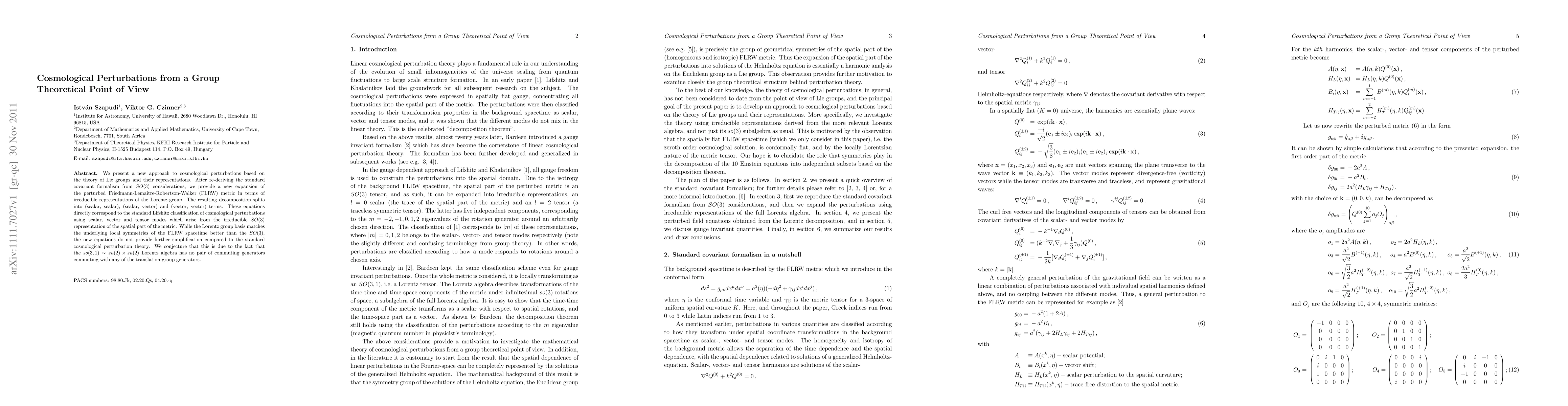 We present a new approach to cosmological perturbations based on the theory of Lie groups and their representations. After re-deriving the standard covariant formalism from SO(3) considerations, we provide a new expansion of the perturbed Friedmann-Lemaitre-Robertson-Walker (FLRW) metric in terms of irreducible representations of the Lorentz group. The resulting decomposition splits into (scalar, scalar), (scalar, vector) and (vector, vector) terms. These equations directly correspond to the standard Lifshitz classification of cosmological perturbations using scalar, vector and tensor modes which arise from the irreducible SO(3) representation of the spatial part of the metric. While the Lorentz group basis matches the underlying local symmetries of the FLRW spacetime better than the SO(3), the new equations do not provide further simplification compared to the standard cosmological perturbation theory. We conjecture that this is due to the fact that the so(3,1) ~ su(2) x su(2) Lorentz algebra has no pair of commuting generators commuting with any of the translation group generators.