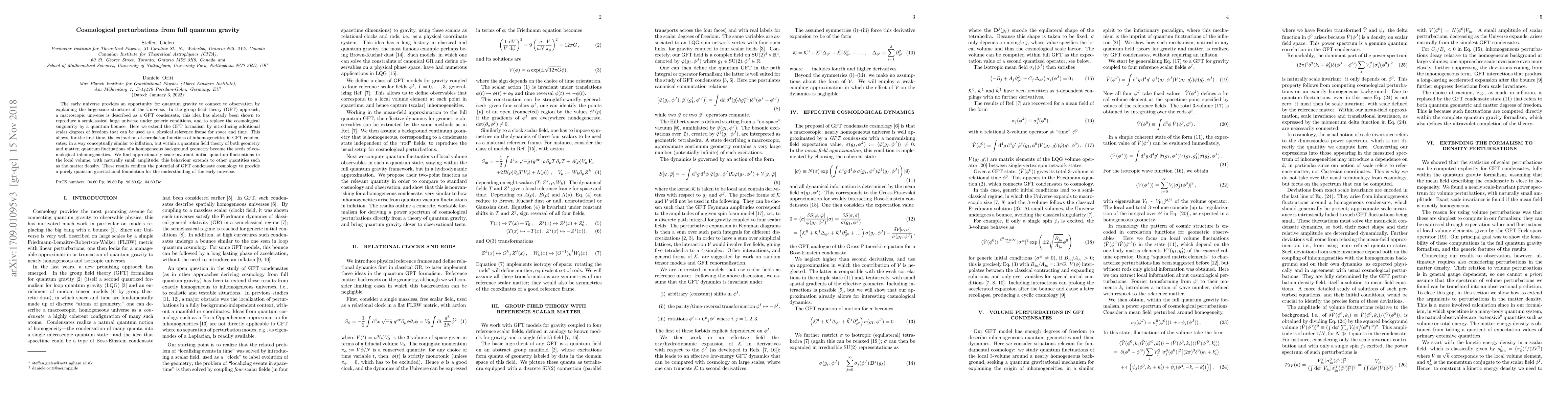 This paper extends the group field theory (GFT) approach to quantum gravity, introducing scalar degrees of freedom to create a physical reference frame. It demonstrates how quantum fluctuations in a homogeneous background geometry can generate cosmological inhomogeneities, leading to approximately scale-invariant initial fluctuations in local volume and matter density, supporting GFT condensate cosmology as a foundation for early universe physics.