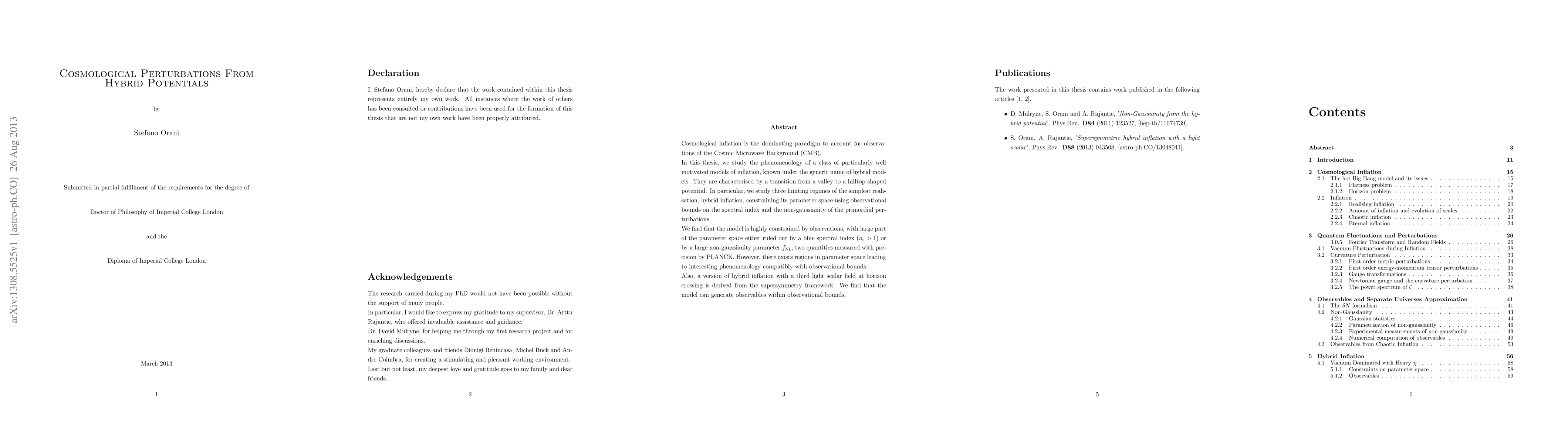 Cosmological inflation is the dominating paradigm to account for observations of the Cosmic Microwave Background (CMB). In this thesis, we study the phenomenology of a class of particularly well motivated models of inflation, known under the generic name of hybrid models. They are characterised by a transition from a valley to a hilltop shaped potential. In particular, we study three limiting regimes of the simplest realisation, hybrid inflation, constraining its parameter space using observational bounds on the spectral index and the non-gaussianity of the primordial perturbations. We find that the model is highly constrained by observations, with large part of the parameter space either ruled out by a blue spectral index ($n_s>1$) or by a large non-gaussianity parameter $f_{rm NL}$, two quantities measured with precision by PLANCK. However, there exists regions in parameter space leading to interesting phenomenology compatibly with observational bounds. Also, a version of hybrid inflation with a third light scalar field at horizon crossing is derived from the supersymmetry framework. We find that the model can generate observables within observational bounds.