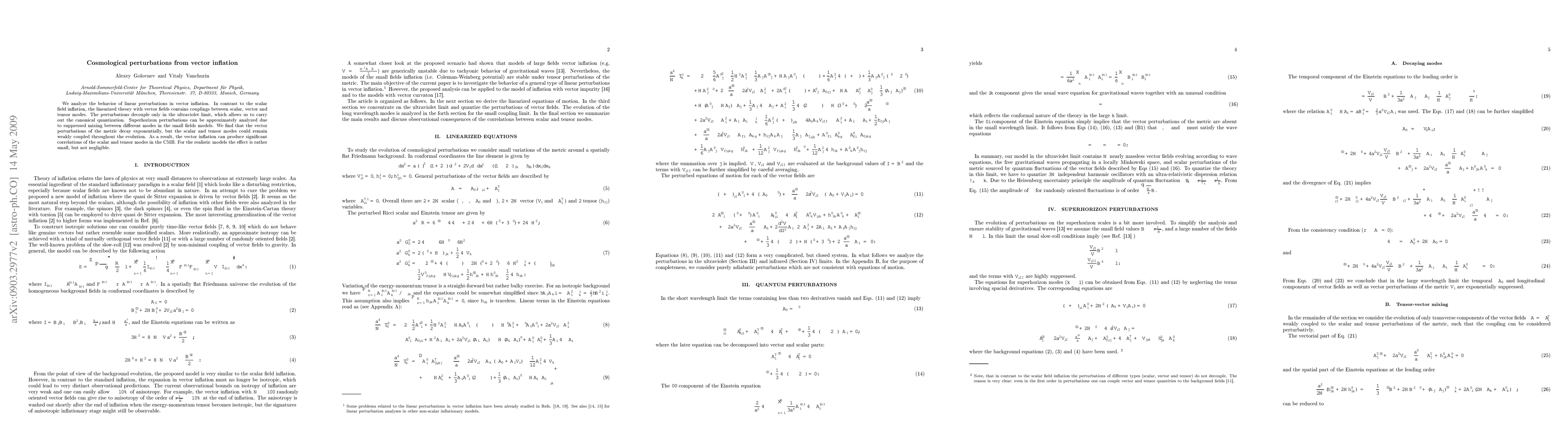 This paper investigates linear perturbations in vector inflation, revealing that unlike scalar field inflation, vector fields introduce couplings between scalar, vector, and tensor modes. While vector perturbations decay exponentially, scalar and tensor modes remain weakly coupled, potentially leading to significant correlations in the CMB, albeit small in realistic models.