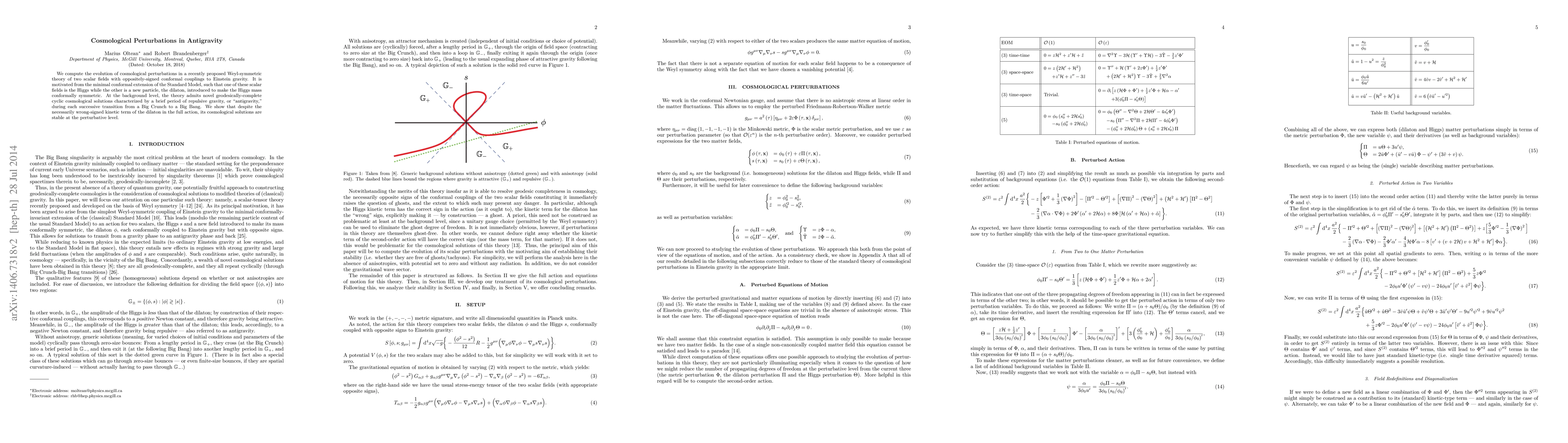 This paper investigates the evolution of cosmological perturbations in a Weyl-symmetric theory featuring two scalar fields with opposite conformal couplings to Einstein gravity, including the Higgs and a new dilaton particle. It finds stable perturbative solutions despite the dilaton's incorrectly signed kinetic term, allowing for cyclic cosmological models with brief periods of repulsive gravity.