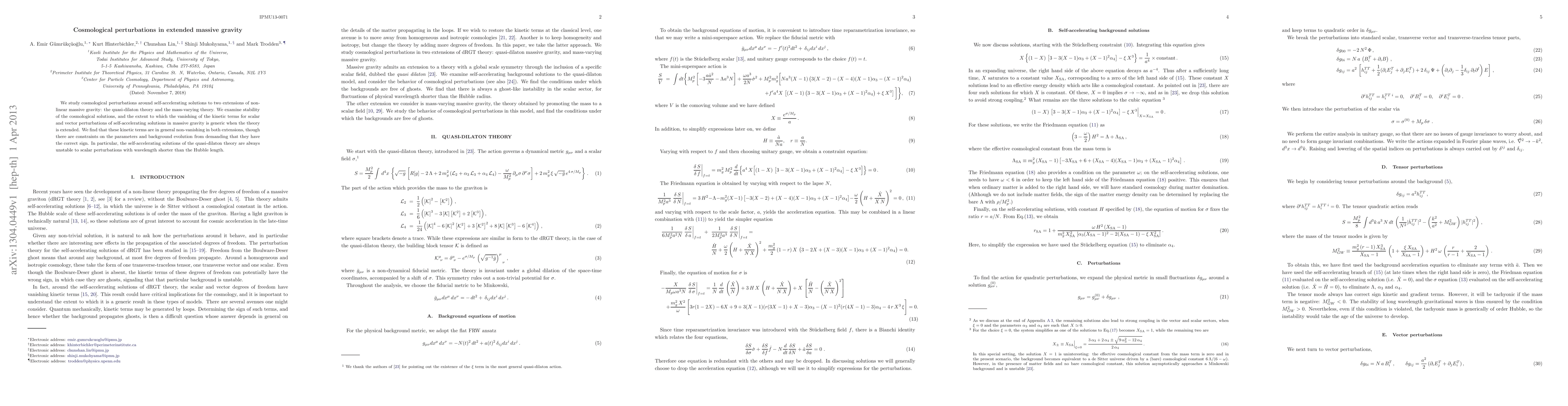 This paper investigates cosmological perturbations in extended massive gravity, specifically in quasi-dilaton and mass-varying theories. It finds that while kinetic terms for scalar and vector perturbations generally remain non-vanishing, self-accelerating solutions in the quasi-dilaton theory are unstable to scalar perturbations with wavelengths shorter than the Hubble length.