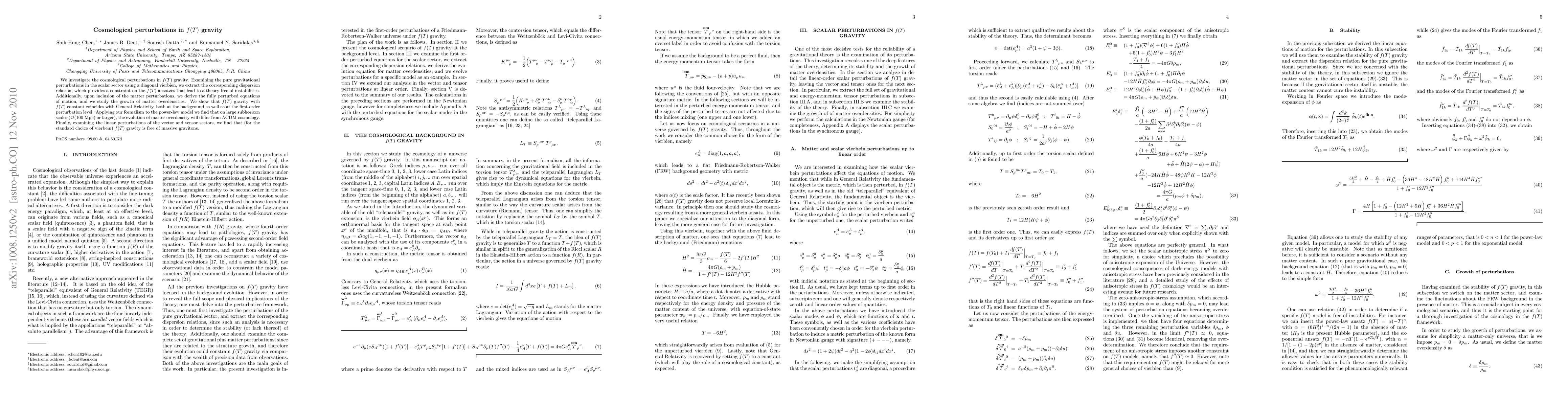 This paper investigates cosmological perturbations in f(T) gravity, showing that it coincides with General Relativity on large scales but diverges on subhorizon scales. It finds that f(T) gravity is free of instabilities and massive gravitons, with distinct matter overdensity evolution compared to LCDM cosmology on large subhorizon scales.