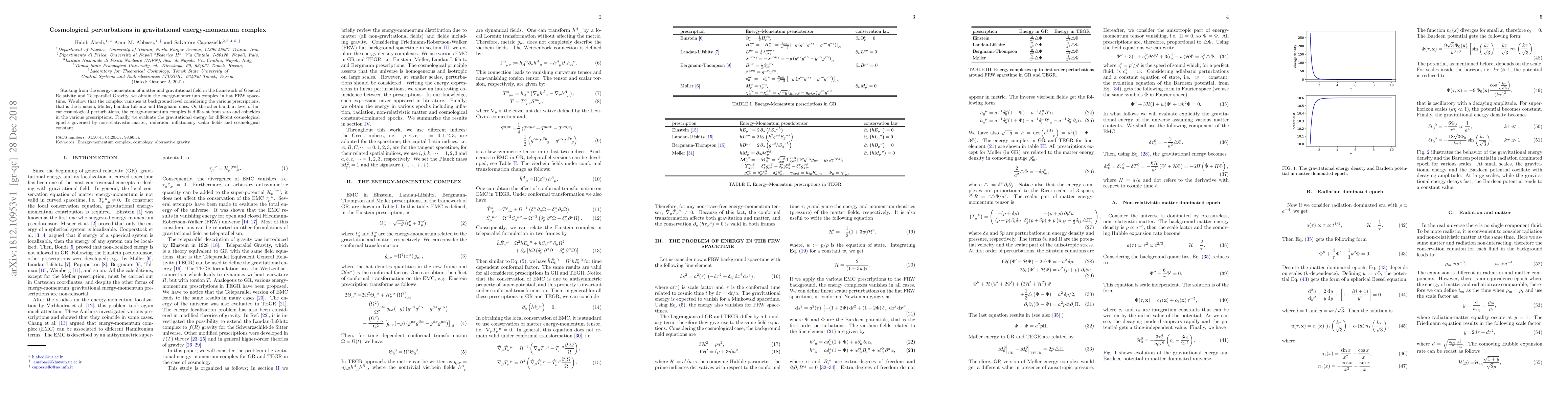 This paper explores the energy-momentum complex in cosmological perturbations within the framework of General Relativity and Teleparallel Gravity, demonstrating that while it vanishes at background level, it is non-zero for linear perturbations. The study evaluates gravitational energy across various cosmological epochs.
