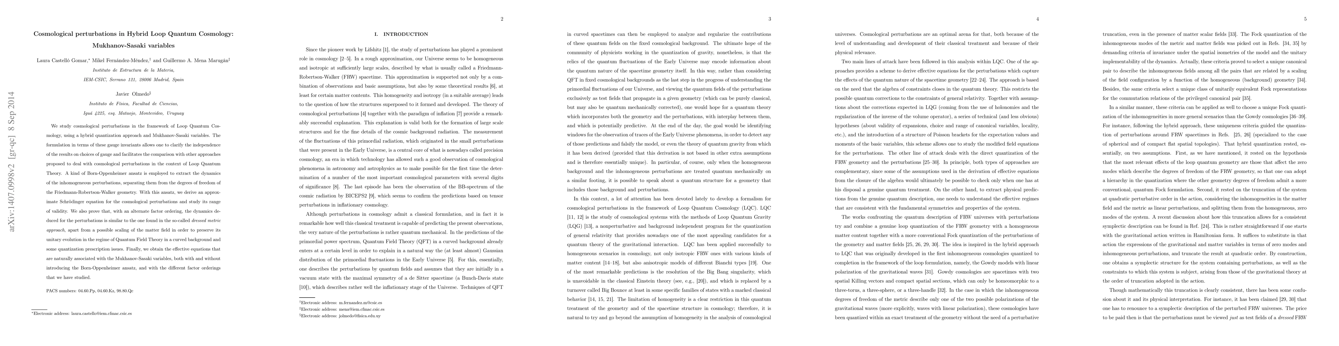 This paper investigates cosmological perturbations within Loop Quantum Cosmology using a hybrid quantization approach and Mukhanov-Sasaki variables, showing independence from gauge choices and deriving an approximate Schrödinger equation for inhomogeneous perturbations. It also compares results with the "dressed metric approach" and explores effective equations linked to the Mukhanov-Sasaki variables.