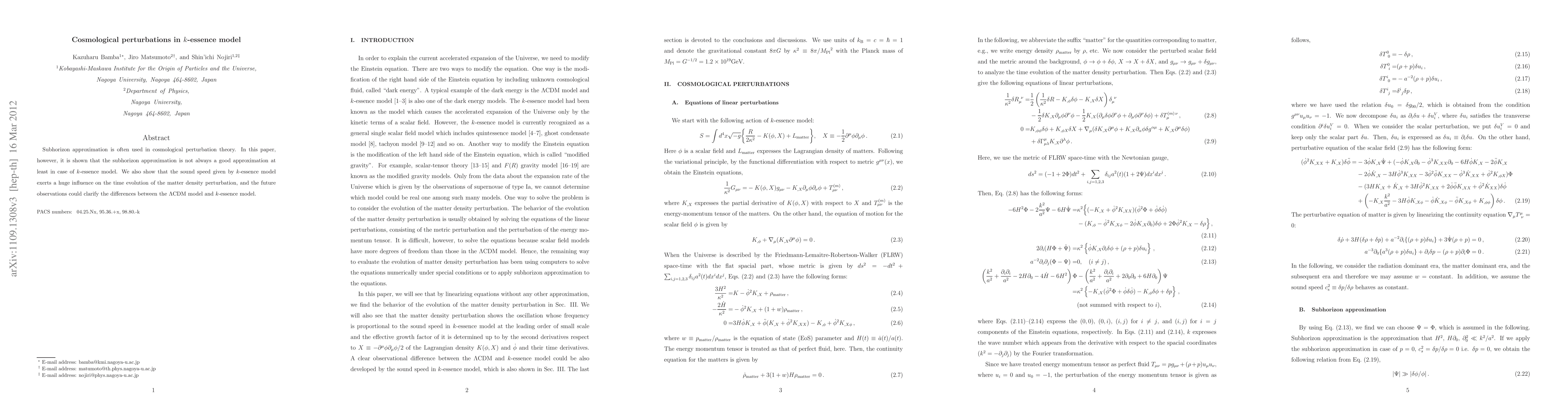This paper demonstrates that the subhorizon approximation fails in the $k$-essence model, highlighting the significant impact of the sound speed on the evolution of matter density perturbations. Future observations may reveal distinctions between the $k$-essence model and the $\Lambda$CDM model.