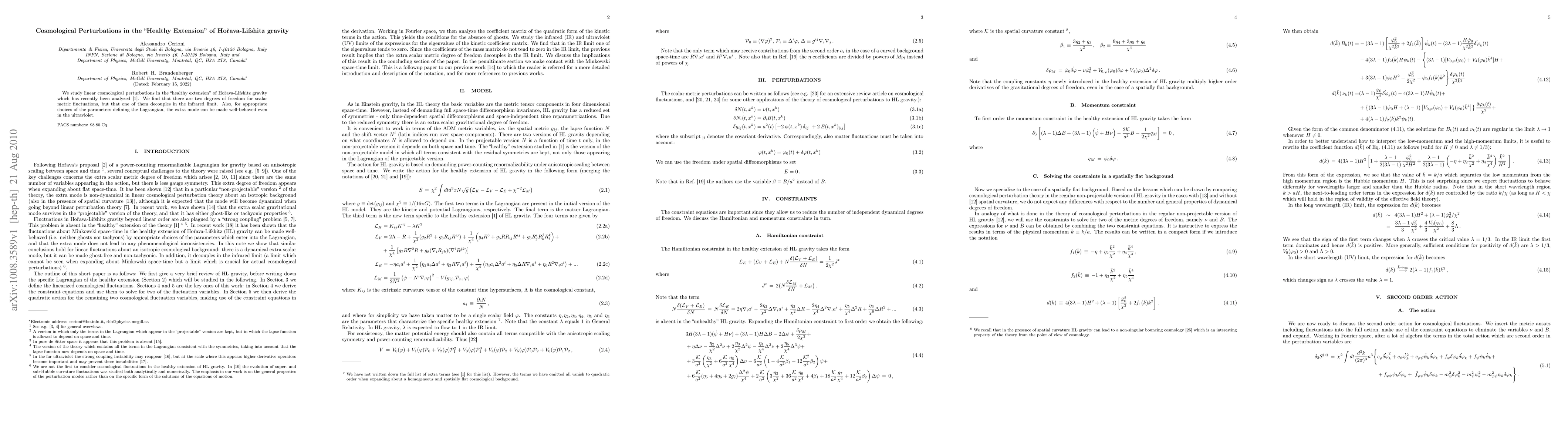This paper investigates linear cosmological perturbations in the "healthy extension" of Horava-Lifshitz gravity, revealing two degrees of freedom for scalar metric fluctuations, with one decoupling in the infrared limit. The study also shows that the extra mode can be controlled and remains well-behaved in the ultraviolet under specific parameter choices.