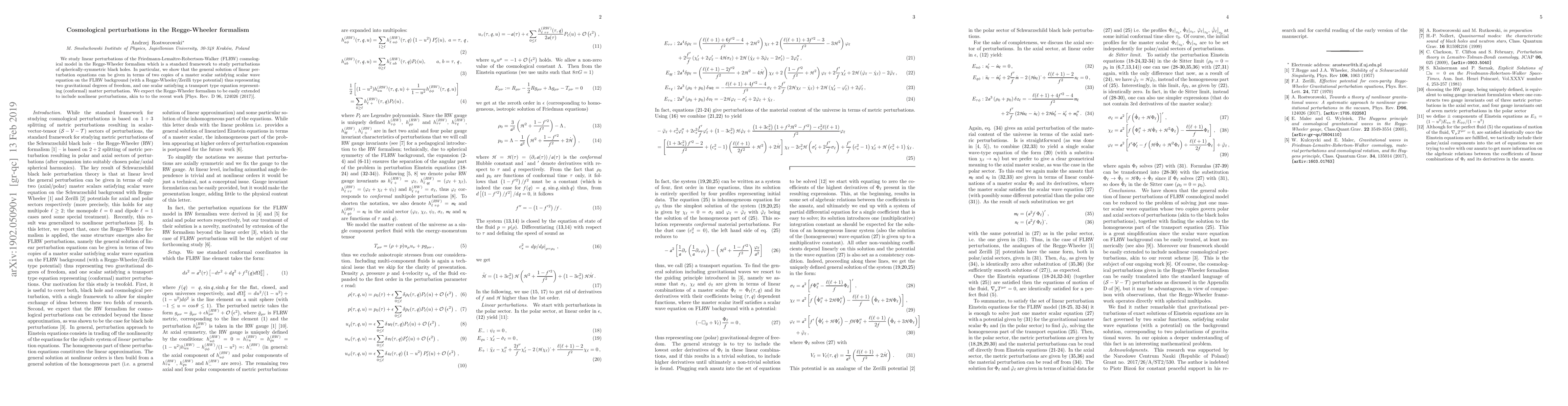 This paper investigates linear perturbations of the FLRW cosmological model using the Regge-Wheeler formalism, revealing two gravitational degrees of freedom represented by a master scalar and a transport type equation for matter perturbations. The authors anticipate extending this approach to nonlinear perturbations.