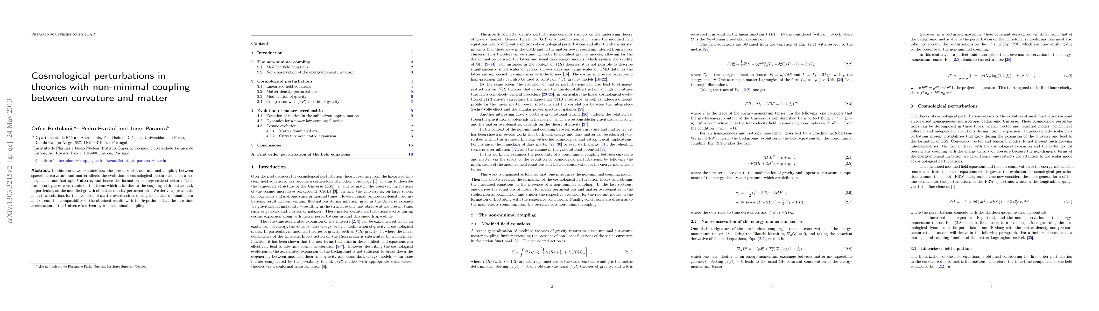 This paper investigates the impact of non-minimal coupling between spacetime curvature and matter on cosmological perturbations, leading to constraints on the coupling terms. It finds that such coupling can influence the growth of matter density perturbations and supports a coupling function consistent with late-time cosmic acceleration.