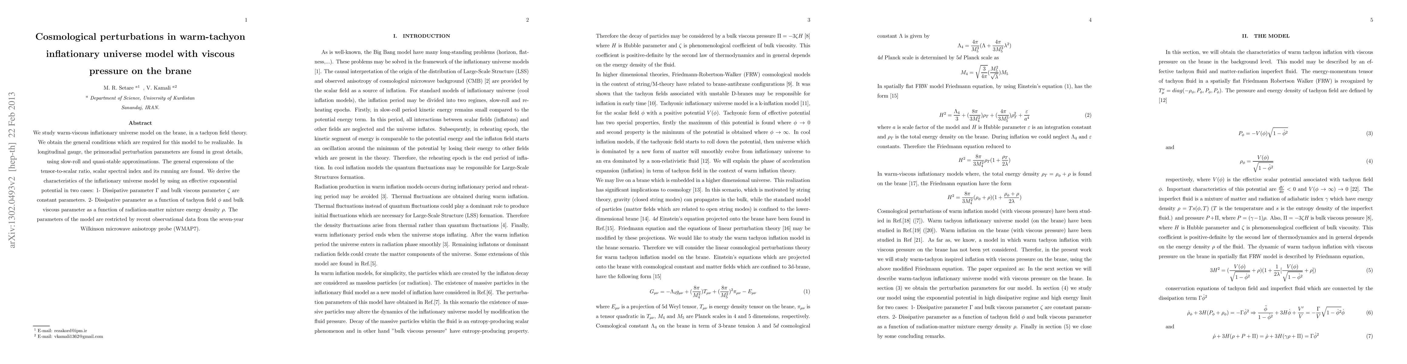 We study warm-viscous inflationary universe model on the brane, in a tachyon field theory. We obtain the general conditions which are required for this model to be realizable. In longitudinal gauge, the primoradial perturbation parameters are found in great details, using slow-roll and quasi-stable approximations. The general expressions of the tensor-to-scalar ratio, scalar spectral index and its running are found. We derive the characteristics of the inflationary universe model by using an effective exponential potential in two cases: 1- Dissipative parameter $\Gamma$ and bulk viscous parameter $\zeta$ are constant parameters. 2- Dissipative parameter as a function of tachyon field $\phi$ and bulk viscous parameter as a function of radiation-matter mixture energy density $\rho$. The parameters of the model are restricted by recent observational data from the seven-year Wilkinson microwave anisotropy probe (WMAP7).