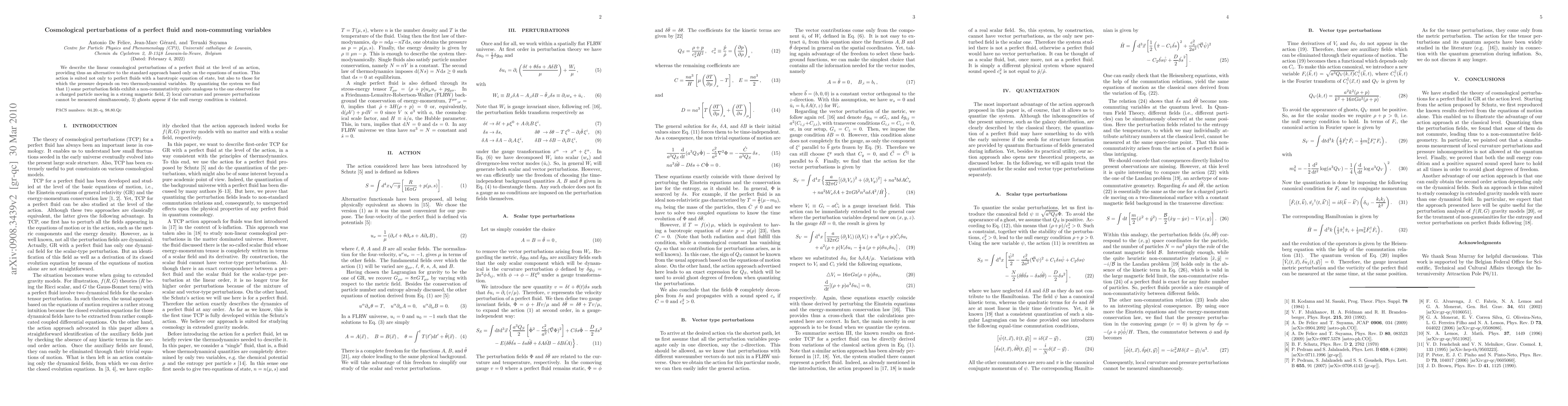 We describe the linear cosmological perturbations of a perfect fluid at the level of an action, providing thus an alternative to the standard approach based only on the equations of motion. This action is suited not only to perfect fluids with a barotropic equation of state, but also to those for which the pressure depends on two thermodynamical variables. By quantizing the system we find that (1) some perturbation fields exhibit a noncommutativity quite analogous to the one observed for a charged particle moving in a strong magnetic field, (2) local curvature and pressure perturbations cannot be measured simultaneously, (3) ghosts appear if the null energy condition is violated.