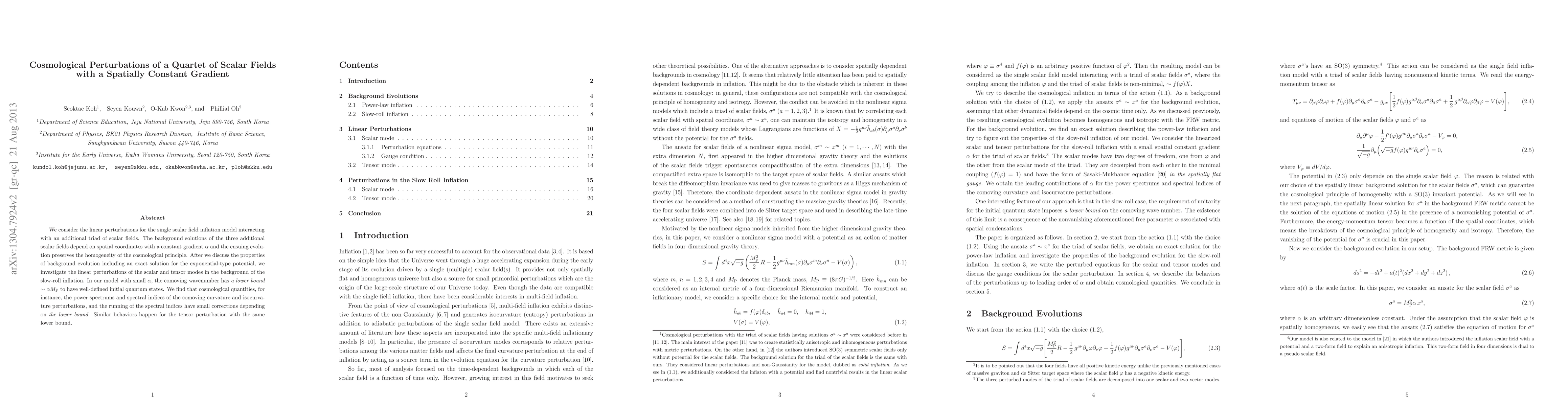 This paper studies linear perturbations in a model of single scalar field inflation interacting with three additional scalar fields, where the background solutions of the latter have a spatially constant gradient. The model reveals small corrections to cosmological quantities like power spectrums and spectral indices, influenced by a lower bound on the comoving wavenumber.