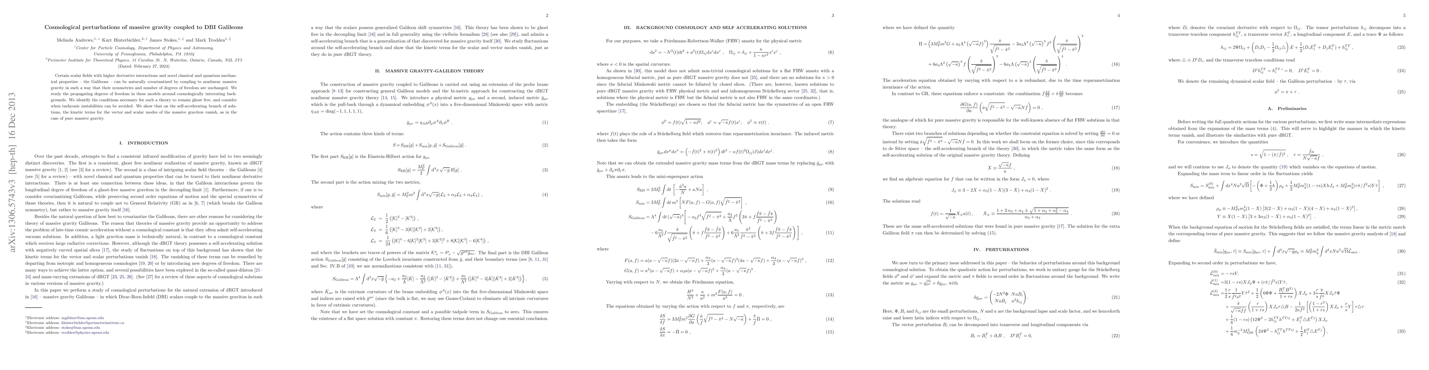 This research paper explores how coupling Galileons to massive gravity preserves their symmetries while allowing them to propagate in a cosmological context. It identifies conditions for the theory to remain ghost-free and avoids tachyonic instabilities on specific branches of solutions.