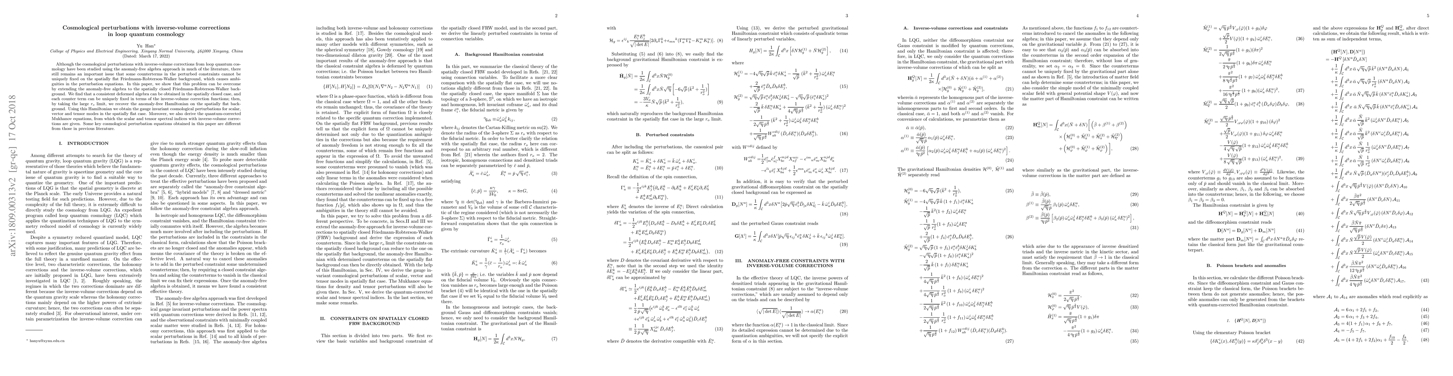 This paper addresses ambiguities in cosmological perturbations in loop quantum cosmology by extending the anomaly-free algebra to a spatially closed Friedmann-Robertson-Walker background, uniquely fixing counterterms, and deriving new gauge-invariant perturbation equations and quantum-corrected Mukhanov equations. The results provide a consistent framework for cosmological perturbations with inverse-volume corrections.