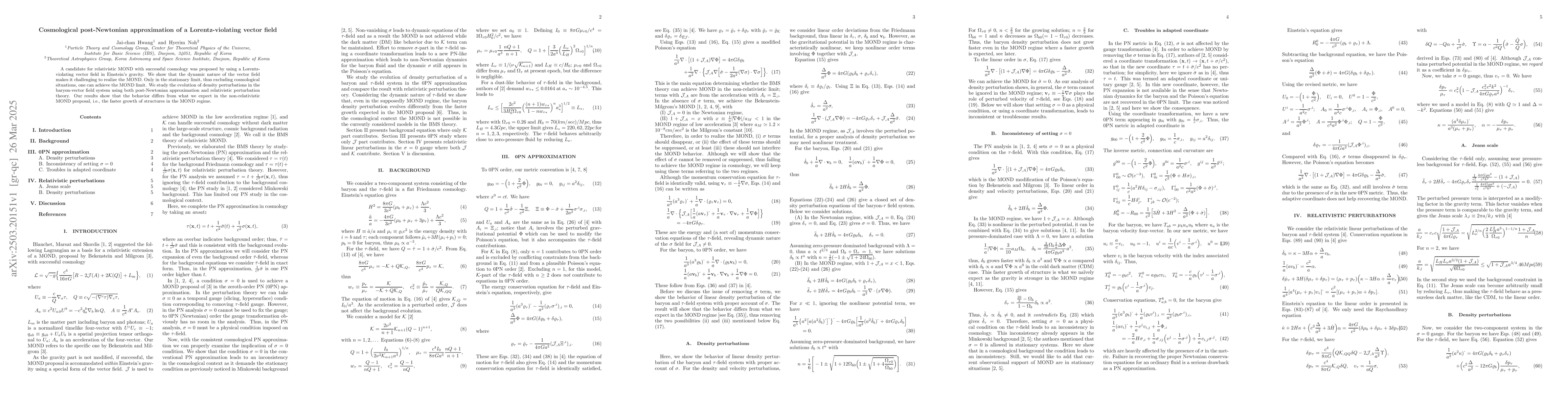 The paper develops a cosmological post-Newtonian approximation framework for a Lorentz-violating vector field in Einstein's gravity, applying it to study the viability of a relativistic MOG in cosmology.