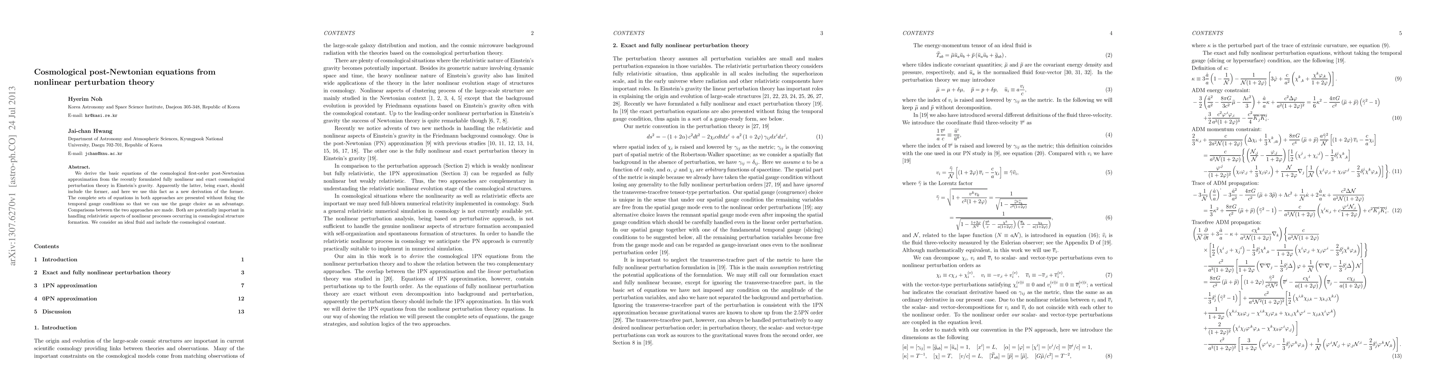 This paper derives the first-order post-Newtonian equations for cosmological perturbations from fully nonlinear and exact perturbation theory in Einstein's gravity, comparing them to traditional methods and highlighting their importance in understanding relativistic effects in structure formation. The analysis includes an ideal fluid and the cosmological constant.