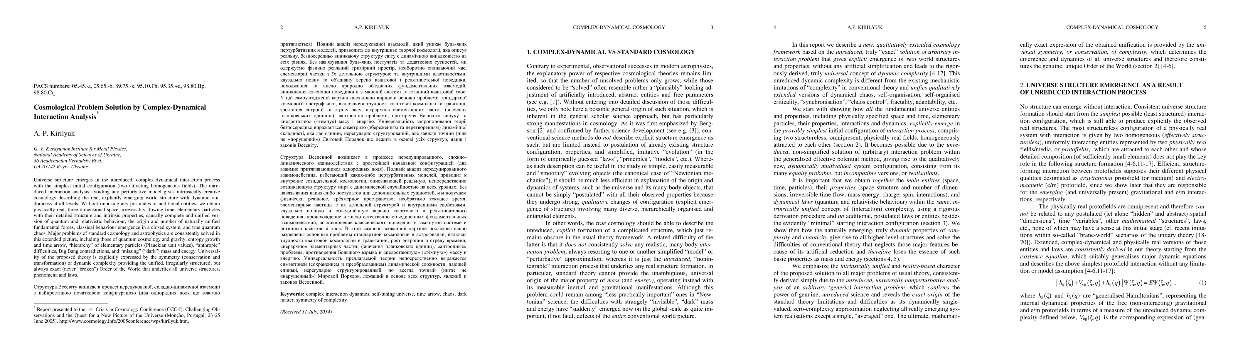 Universe structure emerges in the unreduced, complex-dynamical interaction process with the simplest initial configuration (two attracting homogeneous fields). The unreduced interaction analysis avoiding any perturbative model gives intrinsically creative cosmology describing the real, explicitly emerging world structure with dynamic randomness at all levels. Without imposing any postulates or additional entities, we obtain physically real, three-dimensional space, irreversibly flowing time, elementary particles with their detailed structure and intrinsic properties, causally complete and unified version of quantum and relativistic behaviour, the origin and number of naturally unified fundamental forces, classical behaviour emergence in a closed system, and true quantum chaos. Major problems of standard cosmology and astrophysics are consistently solved in this extended picture, including those of quantum cosmology and gravity, entropy growth and time arrow, "hierarchy" of elementary particles (Planckian unit values), "anthropic" difficulties, Big Bang contradictions, and "missing" ("dark") mass and energy. Universality of the proposed theory is explicitly expressed by the symmetry (conservation and transformation) of dynamic complexity providing the unified, irregularly structured, but always exact (never "broken") Order of the World that underlies all universe structures, phenomena and laws.