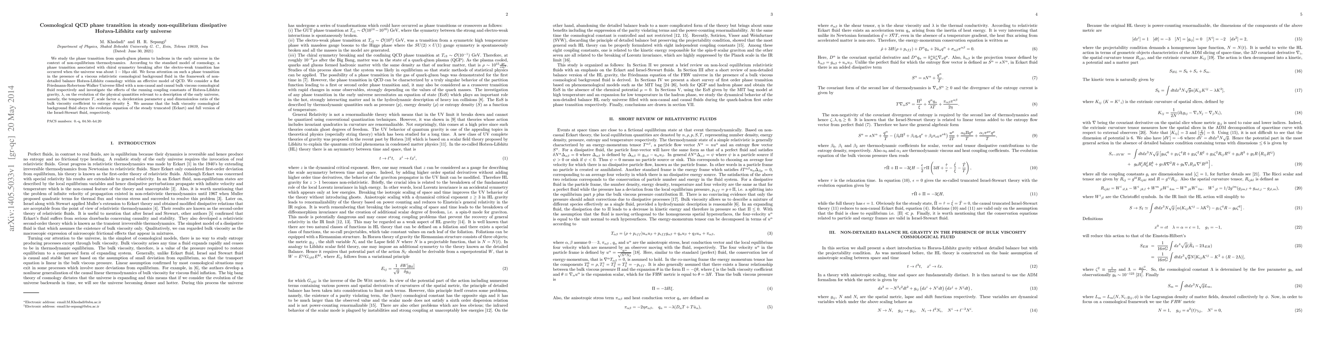 We study the phase transition from quark-gluon plasma to hadrons in the early universe in the context of non-equilibrium thermodynamics. According to the standard model of cosmology, a phase transition associated with chiral symmetry breaking after the electro-weak transition has occurred when the universe was about $1-10\mu s$ old. We focus attention on such a phase transition in the presence of a viscous relativistic cosmological background fluid in the framework of non-detailed balance Ho\v{r}ava-Lifshitz cosmology within an effective model of QCD. We consider a flat Friedmann-Robertson-Walker Universe filled with a non-causal and causal bulk viscous cosmological fluid respectively and investigate the effects of the running coupling constants of Ho\v{r}ava-Lifshitz gravity, $\lambda$, on the evolution of the physical quantities relevant to a description of the early universe, namely, the temperature $T$, scale factor $a$, deceleration parameter $q$ and dimensionless ratio of the bulk viscosity coefficient to entropy density $\frac{\xi}{s}$. We assume that the bulk viscosity cosmological background fluid obeys the evolution equation of the steady truncated (Eckart) and full version of the Israel-Stewart fluid, respectively.
