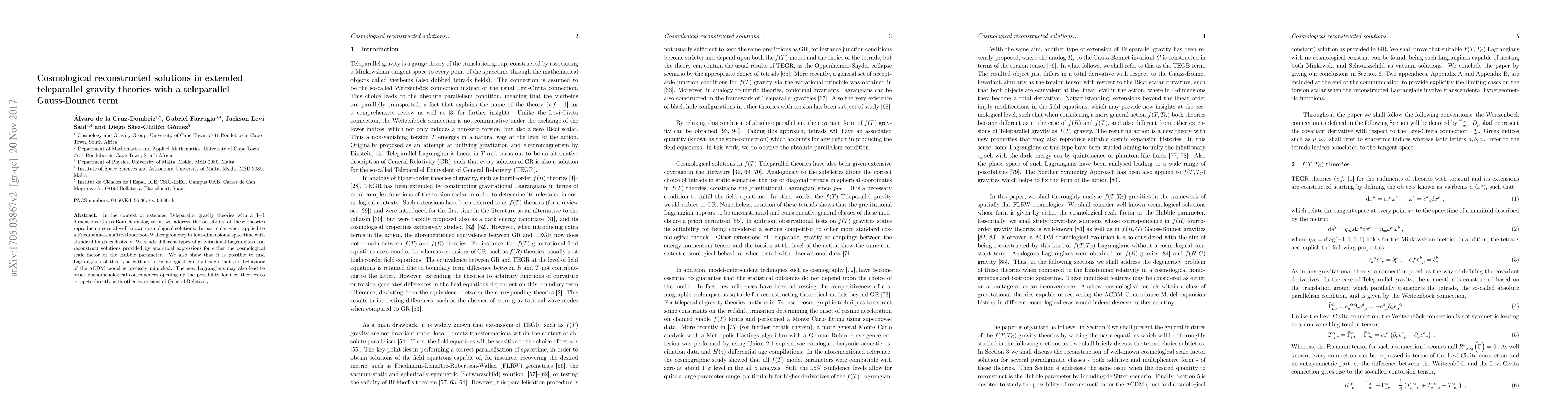 In the context of extended Teleparallel gravity theories with a 3+1 dimensions Gauss-Bonnet analog term, we address the possibility of these theories reproducing several well-known cosmological solutions. In particular when applied to a Friedmann-Lema\^itre-Robertson-Walker geometry in four-dimensional spacetime with standard fluids exclusively. We study different types of gravitational Lagrangians and reconstruct solutions provided by analytical expressions for either the cosmological scale factor or the Hubble parameter. We also show that it is possible to find Lagrangians of this type without a cosmological constant such that the behaviour of the LCDM model is precisely mimicked. The new Lagrangians may also lead to other phenomenological consequences opening up the possibility for new theories to compete directly with other extensions of General Relativity.