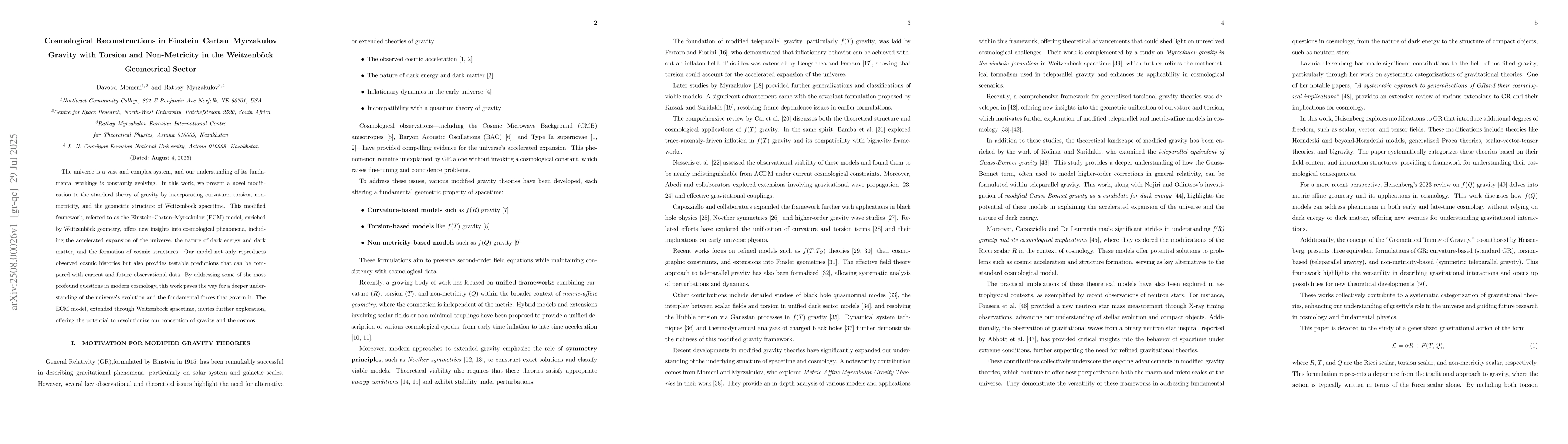 The universe is a vast and complex system, and our understanding of its fundamental workings is constantly evolving. In this work, we present a novel modification to the standard theory of gravity by incorporating curvature, torsion, non-metricity, and the geometric structure of Weitzenb\"{o}ck spacetime. This modified framework, referred to as the Einstein--Cartan--Myrzakulov (ECM) model, enriched by Weitzenb\"{o}ck geometry, offers new insights into cosmological phenomena, including the accelerated expansion of the universe, the nature of dark energy and dark matter, and the formation of cosmic structures. Our model not only reproduces observed cosmic histories but also provides testable predictions that can be compared with current and future observational data. By addressing some of the most profound questions in modern cosmology, this work paves the way for a deeper understanding of the universe's evolution and the fundamental forces that govern it. The ECM model, extended through Weitzenb\"{o}ck spacetime, invites further exploration, offering the potential to revolutionize our conception of gravity and the cosmos.