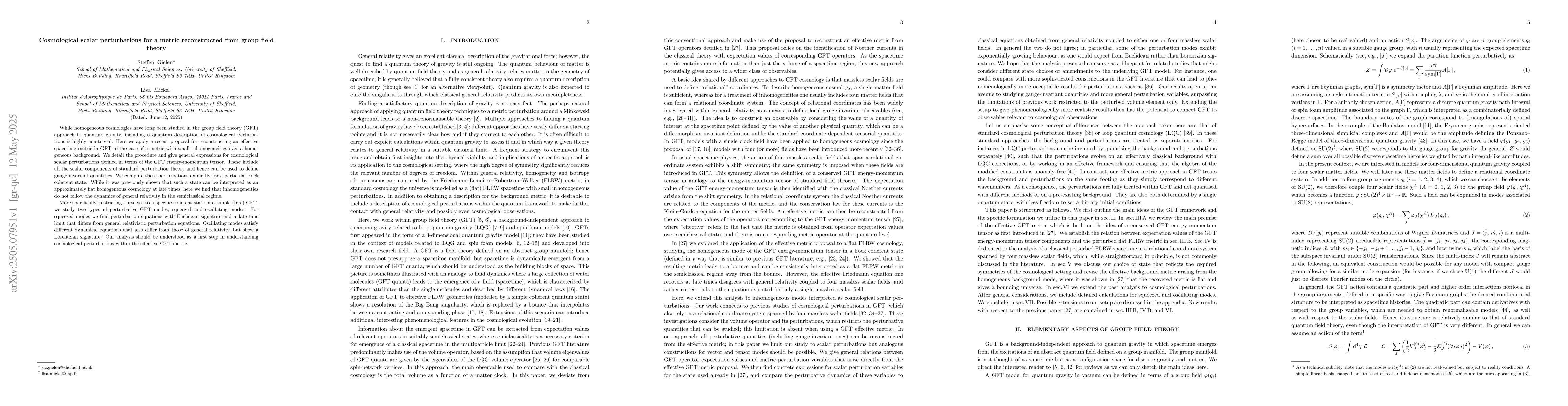 Researchers used group field theory to study cosmological scalar perturbations in a reconstructed metric with small inhomogeneities over a homogeneous background, finding that these perturbations do not follow general relativistic dynamics.