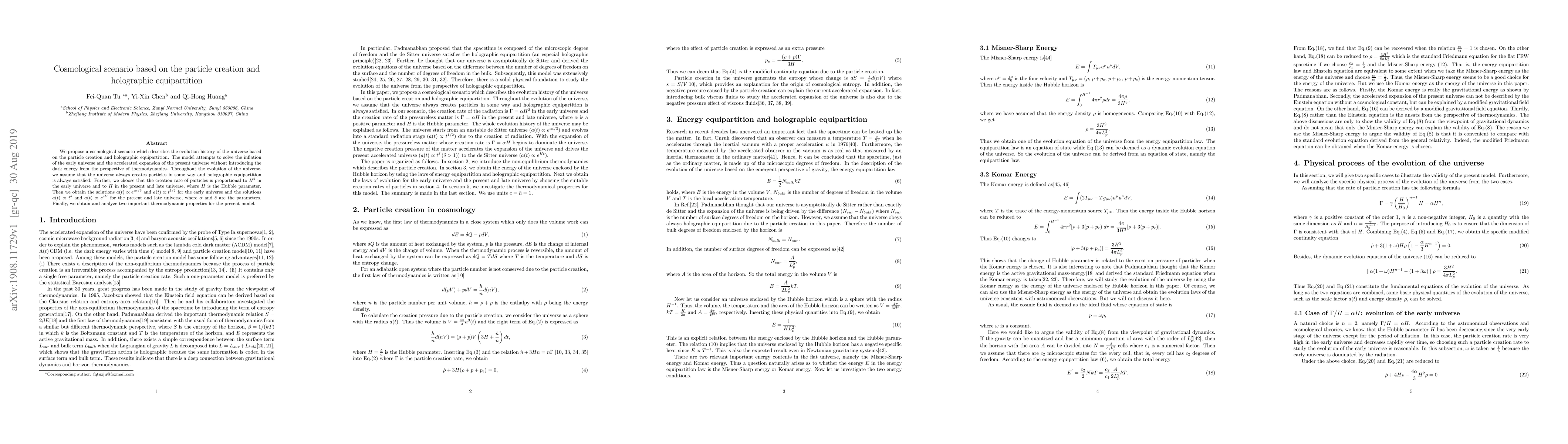 We propose a cosmological scenario which describes the evolution history of the universe based on the particle creation and holographic equipartition. The model attempts to solve the inflation of the early universe and the accelerated expansion of the present universe without introducing the dark energy from the perspective of thermodynamics. Throughout the evolution of the universe, we assume that the universe always creates particles in some way and holographic equipartition is always satisfied. Further, we choose that the creation rate of particles is proportional to $H^{2}$ in the early universe and to $H$ in the present and late universe, where $H$ is the Hubble parameter. Then we obtain the solutions $a(t)\propto e^{\alpha t/3}$ and $a(t)\propto t^{1/2}$ for the early universe and the solutions $a(t)\propto t^{\delta}$ and $a(t)\propto e^{Ht}$ for the present and late universe, where $\alpha$ and $\delta$ are the parameters. Finally, we obtain and analyze two important thermodynamic properties for the present model.