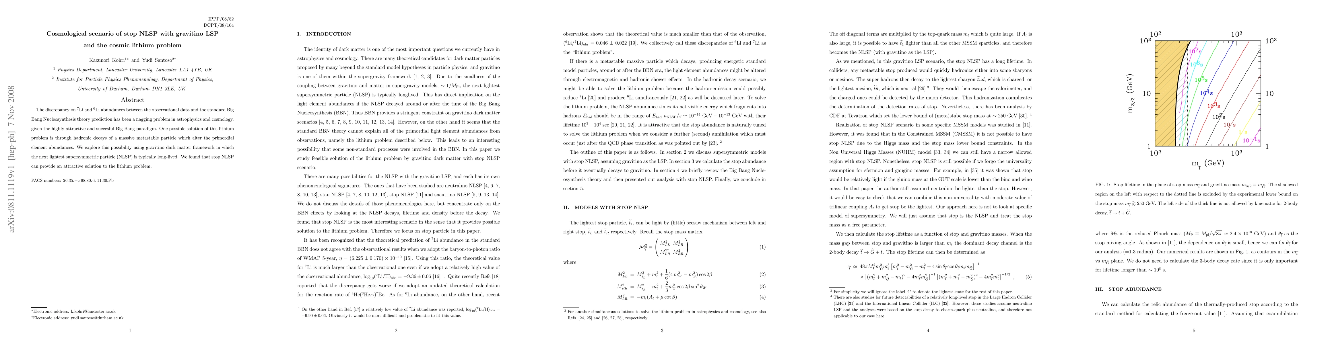 This paper investigates how the next lightest supersymmetric particle (stop NLSP) within a gravitino dark matter framework could resolve the discrepancy in lithium abundances predicted by Big Bang Nucleosynthesis, suggesting that its hadronic decays may alter primordial lithium levels. The findings indicate that this cosmological scenario offers a viable solution to the cosmic lithium problem.