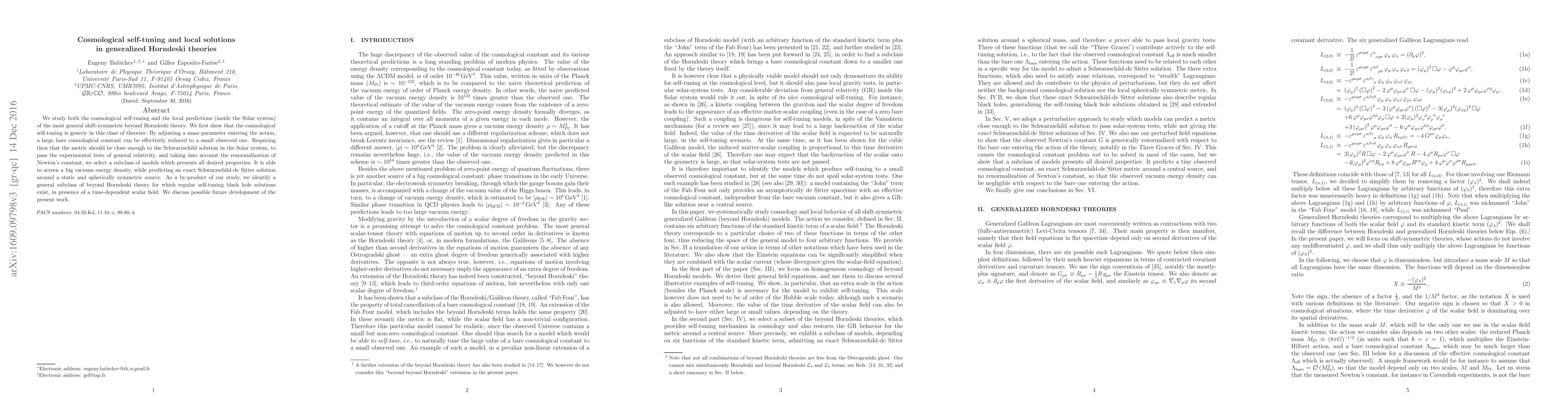 This paper investigates the cosmological self-tuning and local predictions of generalized Horndeski theories, demonstrating that adjusting a mass parameter can reduce a large cosmological constant to a small observed value. It identifies a subclass that satisfies both cosmological and local constraints, predicting an exact Schwarzschild-de Sitter solution in the Solar system.